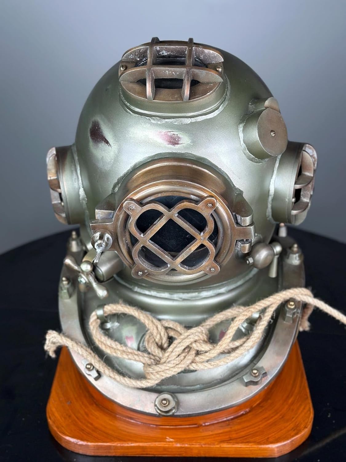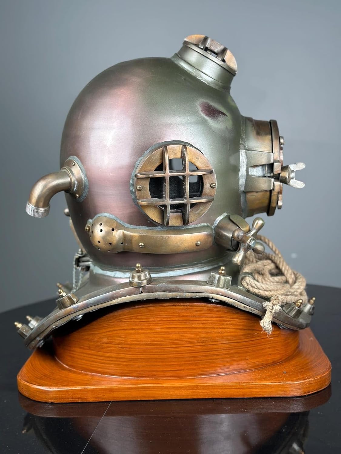 Premium Quality & Well-Crafted ✔ Material: Steel & Aluminum ✔ Size: 18" Full Size ✔ Top Head Measurements: 16" x 12.5" x 17" (40cm x 32cm x 42cm) ✔ Weight: 9 kg (Approx.) ✔ Volume Weight: 18 kg (Approx.) ✔ Finish: Green Dual-Tone Finish (As Shown) 🎖 Key Features: ✅ Wearable & Durable: Made from strong, high-quality metal ✅ Vintage Nautical Appeal: A stunning addition to any helmet collection ✅ Versatile Usage: Ideal for tabletop décor, home & office decoration, or as a unique gift A Diving Helmet Is A Rigid Head Enclosure With A Breathing Gas Supply Used In Underwater Diving In Earlier Time. Bring the charm of the ocean’s past into your space with this exquisite antique-style diver’s helmet. Inspired by historic deep-sea diving gear, this handcrafted brass and copper replica is a stunning piece for home, office, and nautical enthusiasts. The rustic finish and detailed craftsmanship make it a perfect conversation starter, ideal for maritime collectors, vintage lovers, and interior decorators. Whether placed on a desk, bookshelf, or mantelpiece, this nautical relic adds a bold, adventurous touch to any setting. A must-have for history buffs and sea lovers! Step into the golden age of maritime exploration with this 18-inch Vintage Nautical Diving Helmet, masterfully crafted from solid metal with a stunning antique brass finish. Inspired by the iconic deep-sea diver helmets of the early 20th century, this decorative replica sits proudly on a sturdy base, making it a striking statement piece for any room. Whether you’re a collector, a maritime enthusiast, or simply looking to add a bold and historical touch to your space, this helmet captures the adventurous spirit of the sea. Perfect for home libraries, offices, nautical-themed rooms, or bar decor, it combines craftsmanship, character, and history in one unforgettable piece