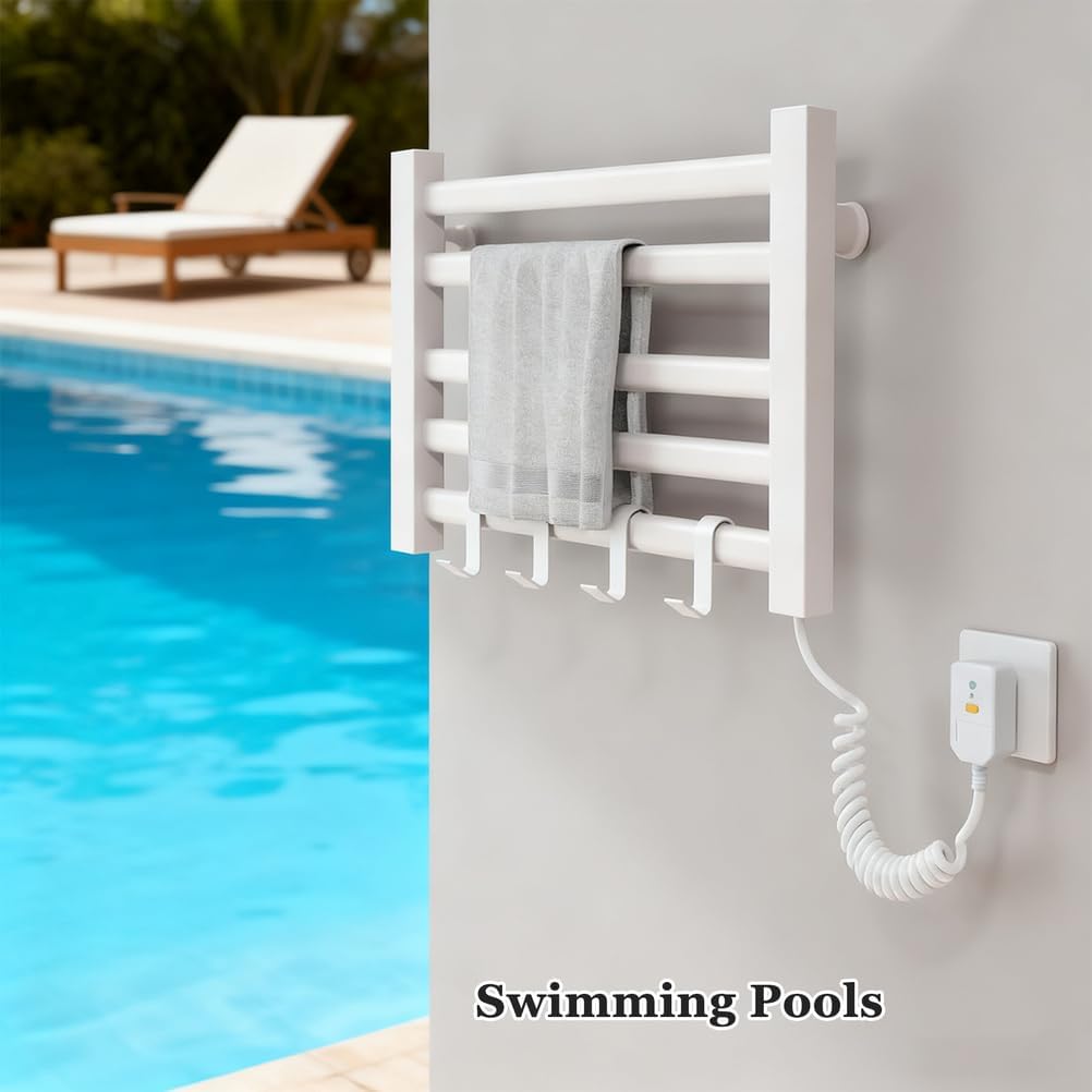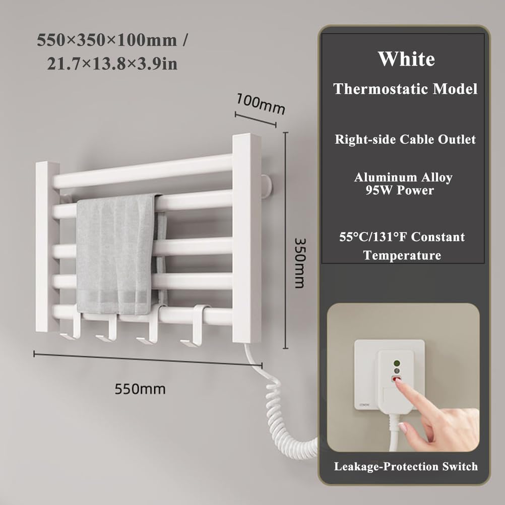 Product Description Transform your bathroom experience with our Heated Towel Rack, a perfect blend of elegance and functionality. This wall-mounted electric towel warmer features a sleek 5-bar design available in white, black, and gray, fitting seamlessly into any decor. Measuring 55×35×10 cm, it’s crafted from durable aluminum alloy, ensuring longevity and efficiency. Designed for versatility, this towel warmer operates at a safe voltage of 110V-220V and boasts a leakage protection plug for added safety. With a power output of 95W and a 1.5m spring cord, it provides a convenient solution for all your warming needs. Achieve a cozy temperature of 131°F (55°C) to wrap yourself in warmth after a bath or shower. The waterproof IPX5 rating guarantees reliable performance, making it suitable for various environments such as bathrooms, spas, kitchens, and even hotels. Whether you're preparing for a relaxing evening at home or need a touch of luxury in a gym or beauty salon, our towel warmer enhances your space with ease. Installation is a breeze with options for drilling or drill-free methods, allowing you to set it up wherever you desire. This heated towel rack is not just a practical accessory but also a thoughtful gift for housewarming occasions or new home celebrations. Elevate your daily routine and indulge in the comfort of warm towels, bathrobes, and even blankets with our premium towel warmer. Experience the difference in your self-care rituals and enjoy the luxury of warmth every day. Package includes: 1 x Heated Towel Rack 1 x Installation Accessories