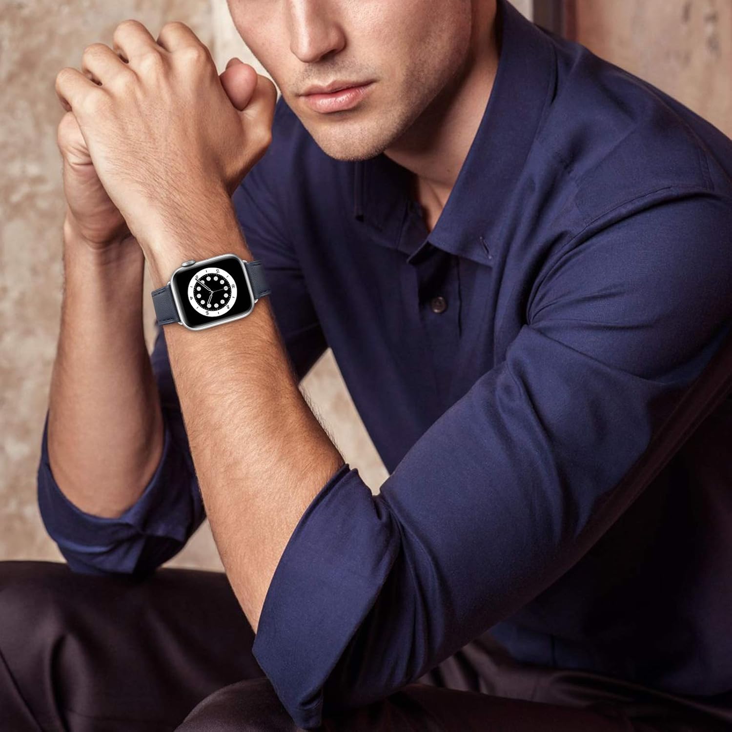Product Description: 1. High-quality materials: The band is made of top genuine leather, which is soft, breathable and comfortable. The metal parts are made of hypoallergenic nickel-free stainless steel and are skin-friendly. 2. High flexibility: The installation design allows you to quickly and easily install and replace the watch in seconds without tools. Elegant, stylish, flexible and durable, suitable for most Business office and party etc. 3.Security : Band comes with stainless steel connectors on both ends, which lock into the watch interface precisely and securely, it is easy to clip on and remove. Product Listing: Genuine Leather strap for Apple Watch SE & iWatch Series 7 & 6 & 5 & 4 & 3 & 2 & 1 * 1.