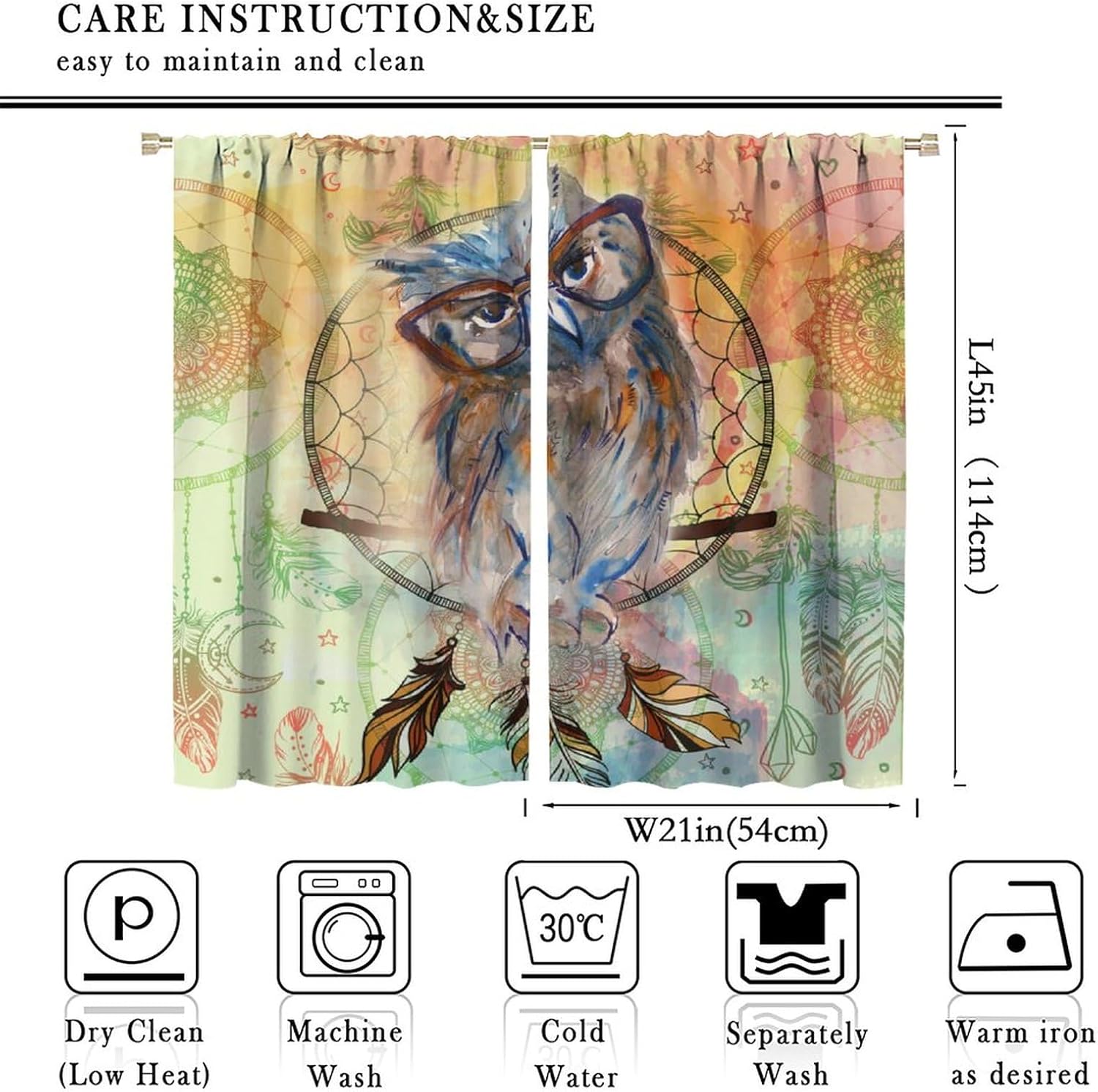 brebasf Watercolor Cute Animals Owl Patterned Blackout Curtains Comes in eight sizes: Total size: 45" L × 42" W (114cm × 107cm),Includes two pieces, each of which measures:45" length × 21" width (114cm × 53.5cm). Total size: 54" L × 42" W (137cm × 107cm),Includes two pieces, each of which measures:54" length × 21" width (68.5cm × 53.5cm). Total size: 63" L × 42" W (160cm × 107cm),Includes two pieces, each of which measures:63" length × 21" width (160cm × 53.5cm). Total size: 63" L × 55" W (160cm × 140cm),Includes two pieces, each of which measures:63" length × 27.5" width (160cm × 70cm). Total size: 63" L × 63" W (160cm × 160cm),Includes two pieces, each of which measures:63" length × 31.5" width (160cm × 80cm). Total size: 72" L × 63" W (183cm × 160cm),Includes two pieces, each of which measures:72" length × 31.5" width (183cm × 80cm). Total size: 63" L × 72" W (160cm × 183cm),Includes two pieces, each of which measures:63" length × 36" width (160cm × 91.5cm). Total size: 84" L × 84" W (214cm × 214cm),Includes two pieces, each of which measures:84" length × 42" width (214cm × 107cm). This Abstract Colorful Dreamcatcher Native American Mandala Curtains liven up your indoor or outdoor spaces with a sense of airiness and beauty.Function: 1. Made of durable polyester fiber,soft and light. 2 The package includes: 2 panels. Curtain material: 98% polyester fiber. Provide a beautiful appearance for your bedroom,living room or office. 3. The curtains are grommet,which can be used with any standard curtain rods. Our products can be used as living room,room curtains. Mother's Day,Christmas,Halloween,Thanksgiving,New Year's party decorations at home! We believe that you will like this curtain as much as we do. If you are not satisfied with our products,please contact us,we will solve any problems encountered by the products for you,so that you are satisf