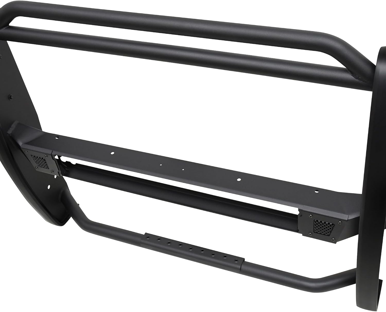Westins Sportsman X Grille Guard effectively combines aggressive styling with heavy duty front end protection. Engineered to provide both great looks and performance, Sportsman Xs unique design compliments todays larger grille designs, and is available to fit most full and mid size truck applications. Sportsman X has an optional detachable mesh panel (sold separately) which is specifically designed to fit the opening in the center section of Sportsman X Grille Guard, or can be removed to accommodate the flush mounted 26in. dual row LED light bar (sold separately). A smaller removable mesh panel designed for the factory sensor location opening is included as standard with Sportsman X. An exterior step plate is located on the 1-5/8in. bottom tube to provide easy access to the engine compartment. Built with heavy duty 2-1/4in. upright rubber strips and 1- 5/8in. outer tubes, Sportsman X Grille Guard is designed to provide protection and style for years to come.