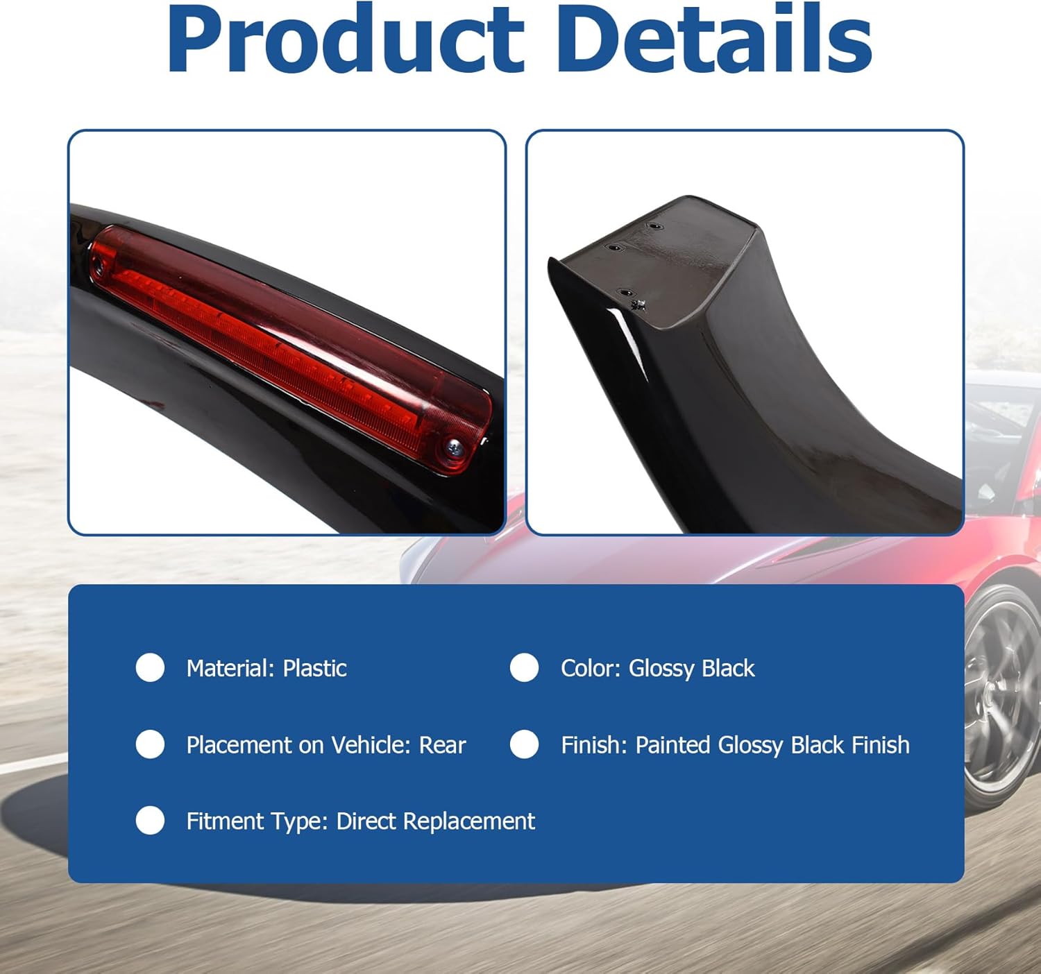 Glossy Black Trunk Spoiler Wing with Brake Light Lamp Replacement for Civic 4-Door Sedan 2013-2015Fitment:Replacement for Civic 2013Replacement for Civic 2014Replacement for Civic 2015Feature:Color: blackMaterial: plasticFinish: painted glossy black finishPlacement on vehicle: rearFitment type: direct replacement Description:Made of quality plastic (painted black)Direct bolt on upgrade part, drilling requiredPackage included:1 x Trunk spoiler wing