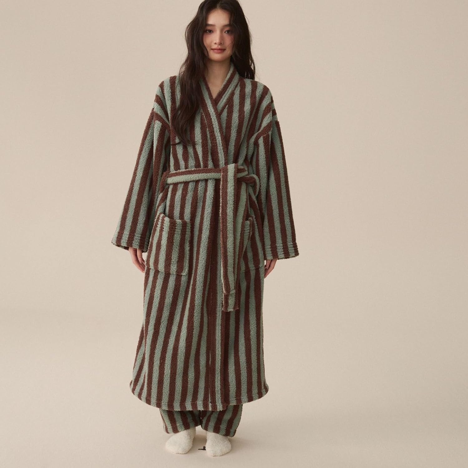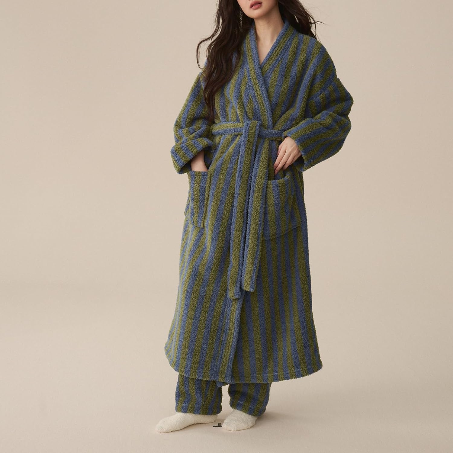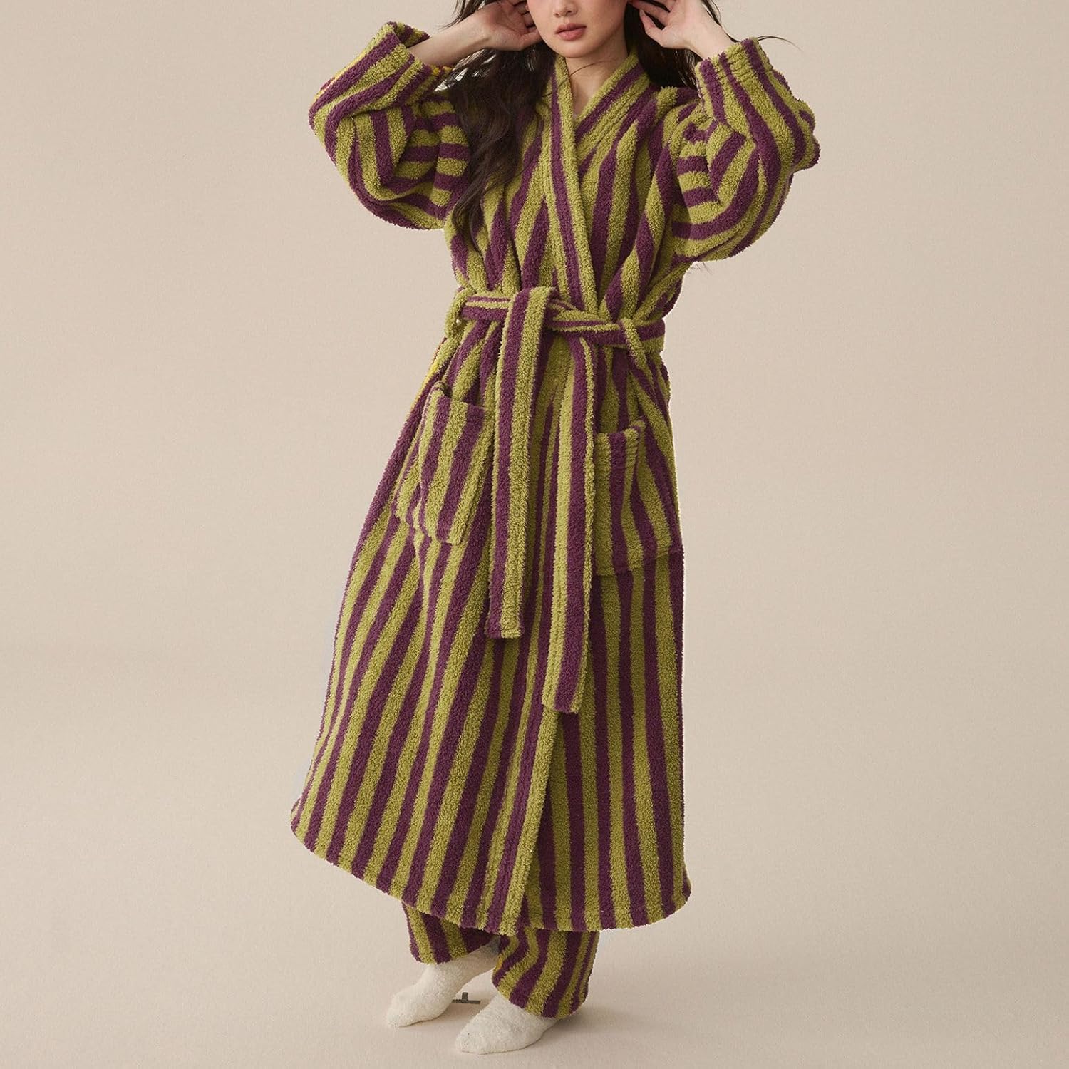 Women's Fuzzy Fleece Long Robe Striped Long Sleeve Plush Kimono Warm Winter Thick Fluffy Oversized Cozy Pockets Belted Hot Tub Bath SPA V Neck Loungewear Maxi BathrobeSize GuideTag size M = US size Small,Tag size L = US size Medium,Tag size XL = US size Large
