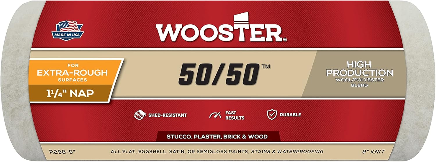 Golden yellow fabric blend of 50% lambs wool and 50% polyester delivers 100% performance in all flat or satin paints, stains, and waterproofing. Wool provides maximum paint capacity and a smooth finish; polyester reduces matting. The Wooster Brush Company has been manufacturing innovative, high-performance painting tools right out of Wooster, Ohio USA since 1851. Our trade names include Ultra/Pro, Advantage, Yachtsman, Shortcut paintbrushes; Super/Fab, Super Doo-Z roller covers; Sherlock frames and extension poles; Jumbo-Koter minirollers; and Prep Crew surface prep tools. You can feel confident knowing Wooster is the name behind your painting tools.