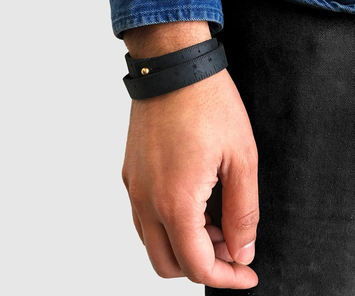 Wrist Ruler is a leather wristband with engraved inch and centimeter measurements. If you find yourself always needing to measure things when you’re on the go, this is the perfect product for you. Sizes are based on wrapping around your wrist twice. Give it extra length depending on how loosely you want to wear it. Please allow an extra 1/2 inch for the stud closure. Workshop products are made in the US. They are produced in small runs.