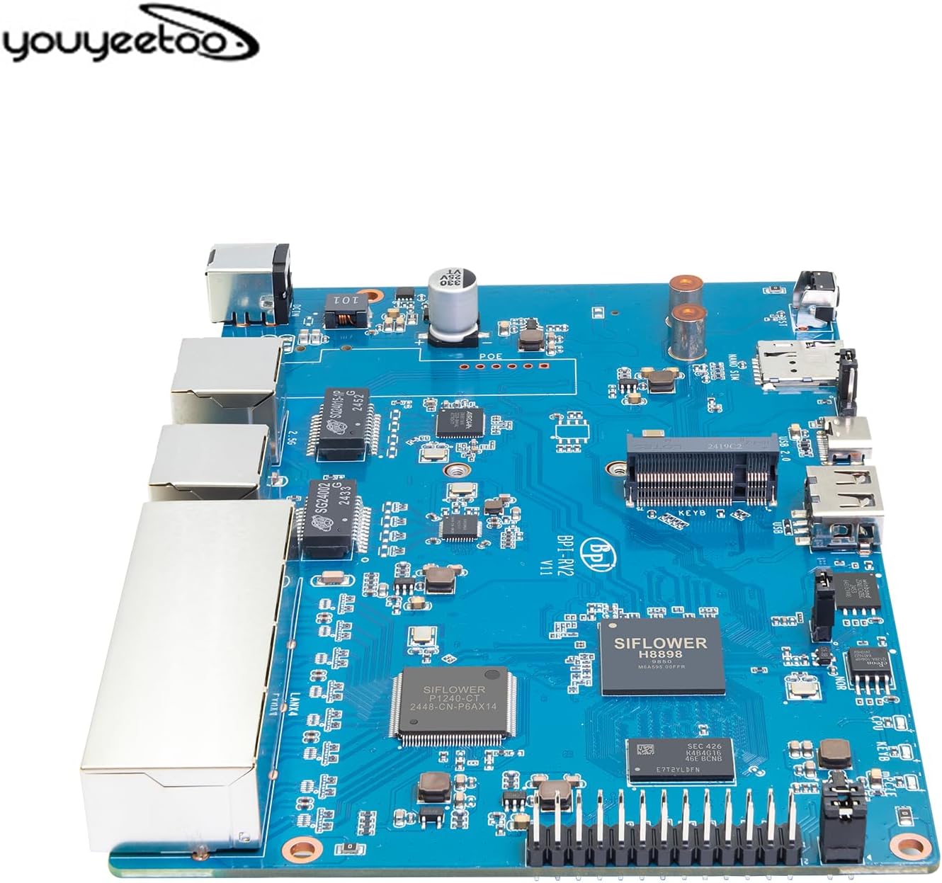 Product Description: RISC-V Gateway Board The Banana Pi BPI-RV2 is a powerful open-source gateway board designed for enterprise networking, industrial control, and embedded development. It features the Siflower SF21H8898 SoC with a quad-core RISC-V processor running at 1.25GHz, providing robust performance for demanding applications. Key Features:Processor: Siflower SF21H8898 SoC with a 4-core RISC-V processor @ 1.25GHz.Memory: 512MB DDR3 RAM.Storage: 128MB SPI NAND Flash for U-boot and Linux systems; 16MB SPI NOR Flash (write-protected by default, refreshable via jumper).Networking: 1 × 2.5GbE RJ45 port and 5 × Gigabit RJ45 ports, supporting QSGMII, SGMII/HSGMII, and RGMII interfaces.USB: USB Type-C port (device, console) and 1 × USB 2.0 Type-A USB HOST port.Debugging: Console access via USB-C or 3-pin connector.Additional Features: Reset and user buttons, boot selection (NAND or NOR), and 802.3at/af PoE modules support.Dimensions: 148 mm × 100.5 mm.Applications:Enterprise Networking: Ideal for high-performance network gateways, routers, and switches.Industrial Control: Suitable for industrial automation and IoT gateways.Development: Perfect for experimenting with RISC-V architecture and embedded systems. Support: Support#youyeetoo.com (# >>>@) Forum: Forum.Youyeetoo.com (recommend) Communication and individual advice: am2#youyeetoo.com (# >>>@)