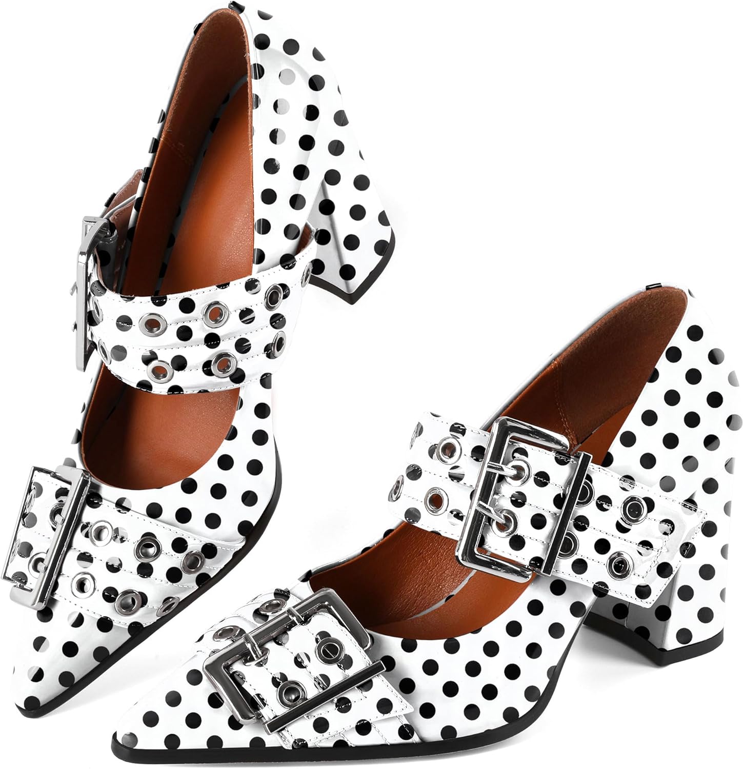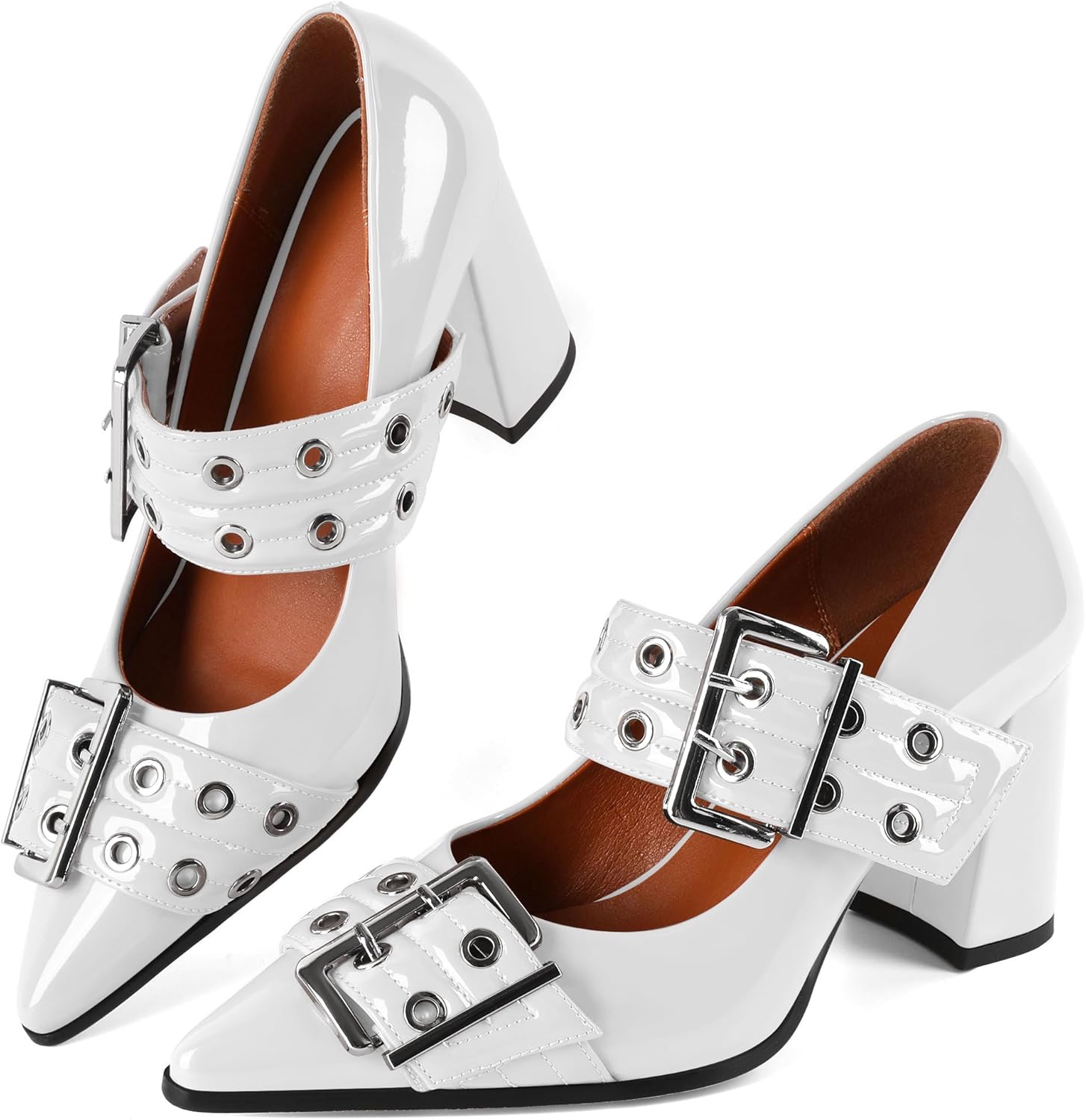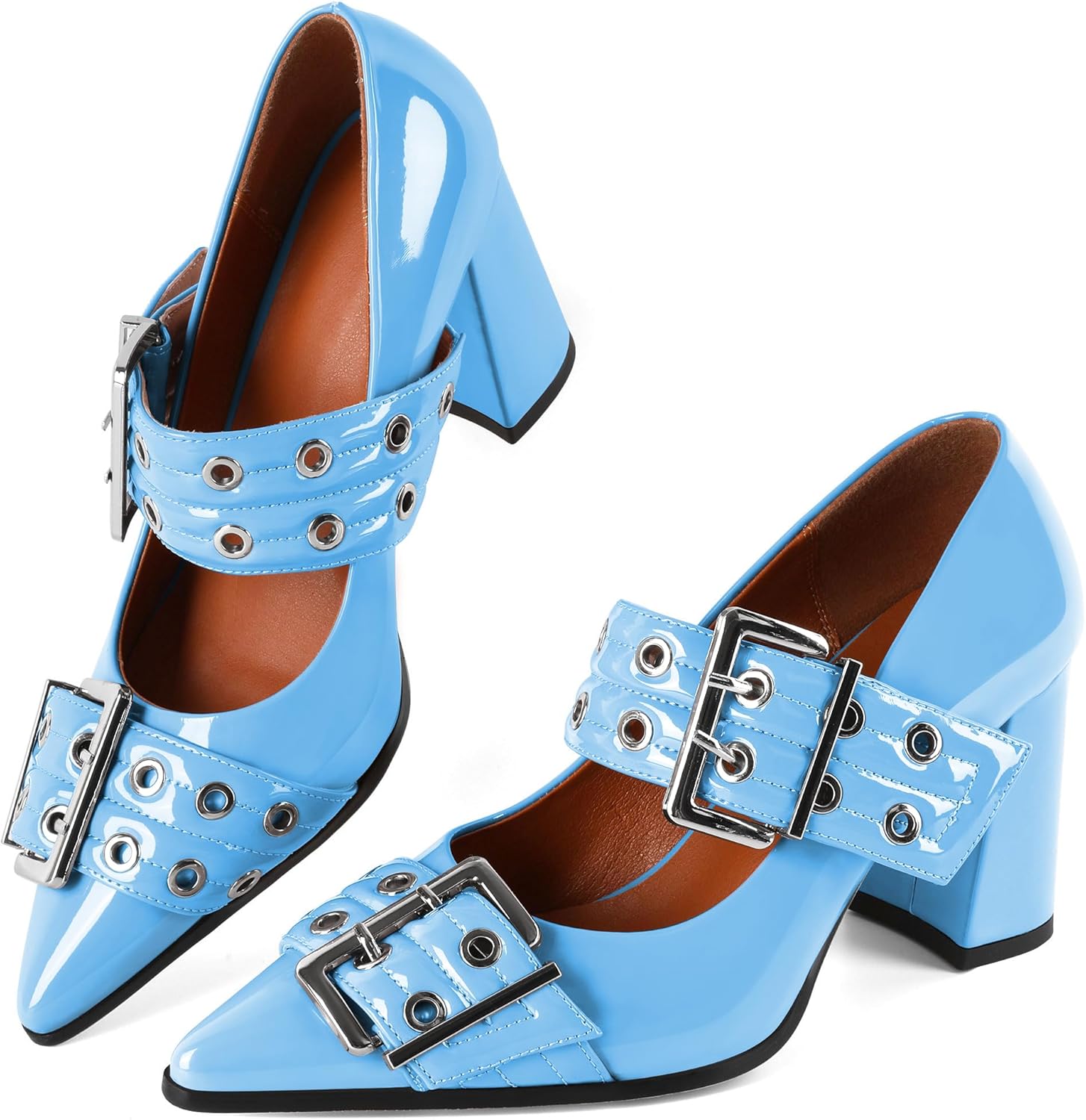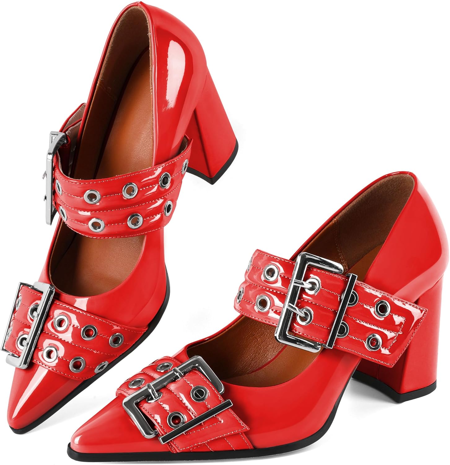 Zamikoo Women Mary Janes Chunky Heel Pumps Shoes Closed Pointed Toe Buckle Strap Slip On High Heels Dressy 3.5 Inches