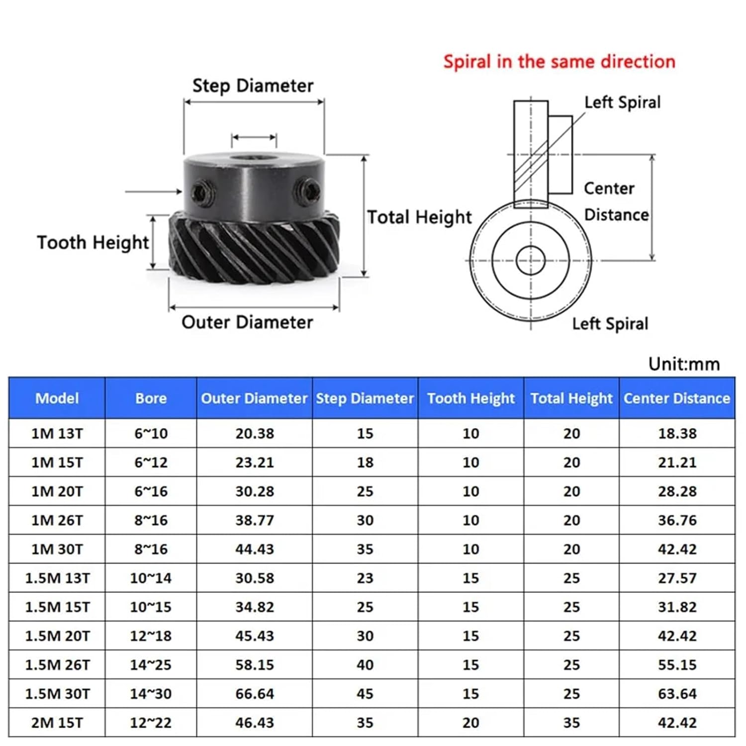 Miter GearsSpecification:Name: 1.5M Left Helical GearDirection: 45 degree left rotationMaterial: 45# steelSurface Treatment: BlackenedTeeth: 13/15/20/26/30 TeethBore: 10/12/14/15/16/17/18/20/22/24/25mmBore Type: Keyway HoleTooth Surface Hardness: Hardened tooth surface