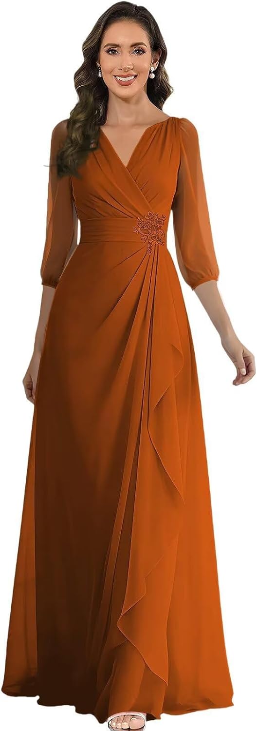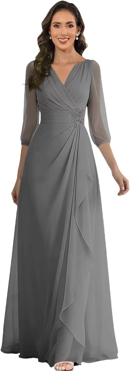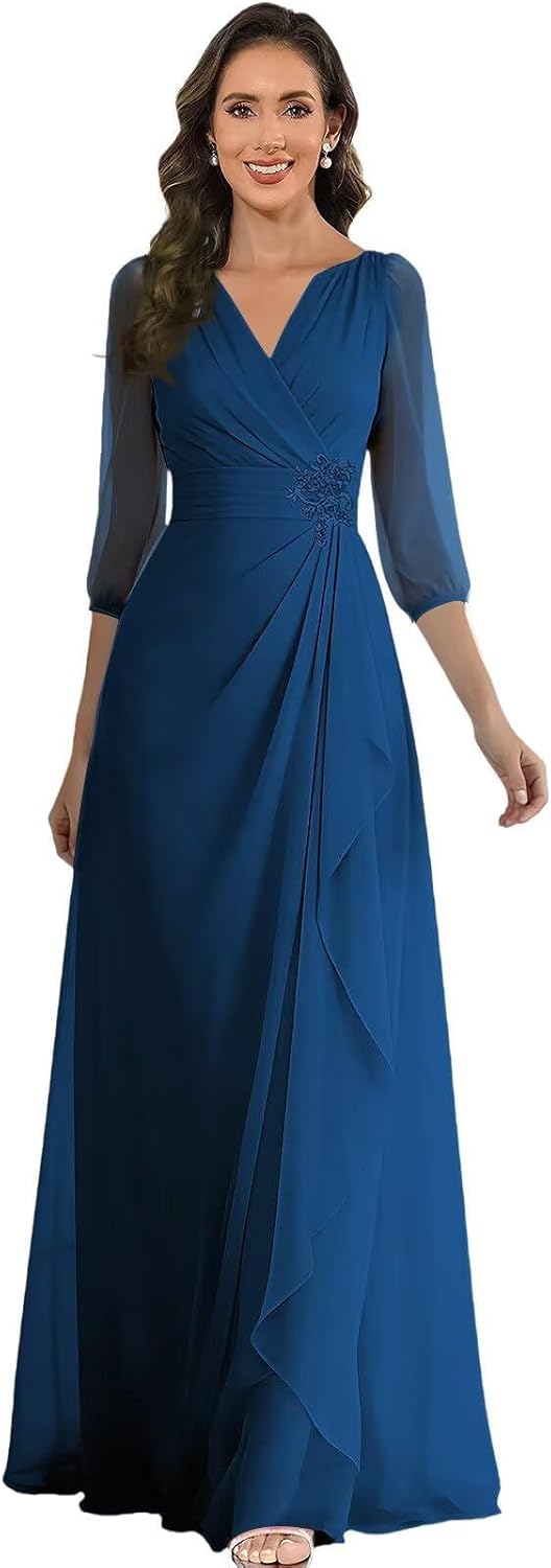 Welcome to Our Store Product Title:SZZJMK 3/4 Sleeves Mother of The Bride Dresses for Wedding Long V-neck Formal Dress Chiffon Lace Appliques Mother of Groom Dress Material:Chiffon& Lace Appliques Neck:V-neck Feature:Ruched,Pleated Built-in Bra:Yes Silhouette:A-line Length: Floor Length Occasion:Wedding,Bridesmaid,Formal Evening,Prom,Ball,Engagement,Wedding Guest Dress,Cocktail Party,Homecoming,Other Special Occasion. Note: 1.If you have any question about the dresses(such as size, color), please feel free contact us. 2.The real color of the item may be slightly different from the pictures shown on website caused by many factors(such as your monitor,light brightness) 3.Washing: Dry Clean /Hand wash cold/Air Dry(Don't bleach),it can be ironed at low temperature if necessary. Free Customization Service If you need custom size,please send your following measurements to us by Amazon messages. 1.Bust _____Inch(cm) 2.Waist _____Inch(cm) 3.Hips _____Inch(cm) 4.Hollow to Hem(without shoes) _____Inch(cm) 5.Height(without shoes) _____Inch(cm) 6.Heels _____Inch(cm)
