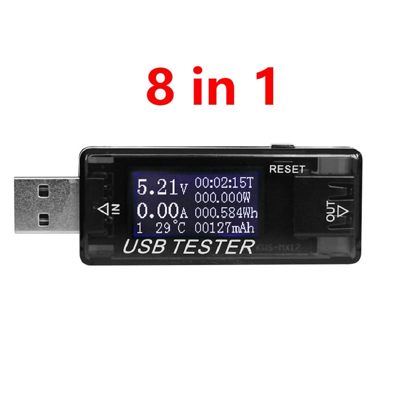 Ammeters8 in1 QC2.0 3.0 4-30v Electical power USB capacity voltage tester current meter monitor voltmeter ammeterA,B option:8 in 1 Model:KWS-MX171.Voltage:DC4-30V 2.Current:0-5A3.Time:0-99hours 4.Power:0-150W5.Capacity:0-99999mAh 6.Electical energy:0-999.999Wh7.Packet data:1-9group 8:temperature 9.Setup KeyFeatures:USB multifunction testerLong press button for 3 seconds to clear the current single set saved data(time, Wh, mAh).Clicking the button once to save packet data (time, Wh, mAh).Digital display0-99999 mAh capacity0-999.999Wh electical energySpecifications:Packet data: 1-9 groupVoltage: DC 4-30VTime: 0-99 hoursPower: 0-150WCurrent: 0-5ASize: 72x24x13mmColor: Blue, BlackEasy to use:Click the button once check save packet data (Time, Wh, mAh). Long press button for 3 seconds to clear the current single set of saved data (Time, Wh, mAh)C /D option : Below is 3 in 1 for blue/black color.QC2.0 3.0Measuring range 3-20V(V)Input voltage 3-20V(V)Output voltage 3-20V(V)Ambient temperature -10-60(°C)Voltage measurement error 1%Easy to use:Size (L x W x H): 68mm x 23mm x 12mm (26.5" x 9" x 4.7")Measuring range: 5-20VCurrent: 0-3.3AInput voltage: 3.5-9VBattery capacity: 0-99999mAhWorking time: 0-99HWorking hours and power capacity memory function after power offModel number: USBPrecision: plus or minus 1%Package Content: Ammeter Voltage Charger USB Detector TesterNote: Due to the difference between different monitors, the picture may not reflect the actual color of the item. E option: 9 in 1Time cut-off power supplyResistance: 0-999.99Power: 0-150WVoltage and current: DC4-30V; 0-5A, Delay: 0-99 hours; 0-24 hoursVoltage over-current protection range: 30V / 5AMonitoring Content: USB voltag