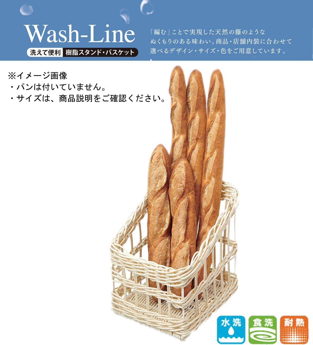 The Wash-Line series reproduces the texture of natural materials using resin and is washable for easy care. Water resistant, durable, easy to care for, and hygienic. Dishwasher safe for commercial use (*Heat resistant temperature of 248°F (120°C). Unlike natural materials, there are no splinters, so the product does not damage easily, and is lightweight and durable. Made from "knitting" resin, this product has a warm, luxurious feel and a natural rattan texture. This French pan stand is the most effective way to convey the image of freshly baked goods and is easy to remove. The rattan texture is stylish and allows you to display your French bread more delicious. Available in a wide variety of designs, sizes and colors to suit your preference depending on the product's interior ● Available in 2 colors (brown, white).