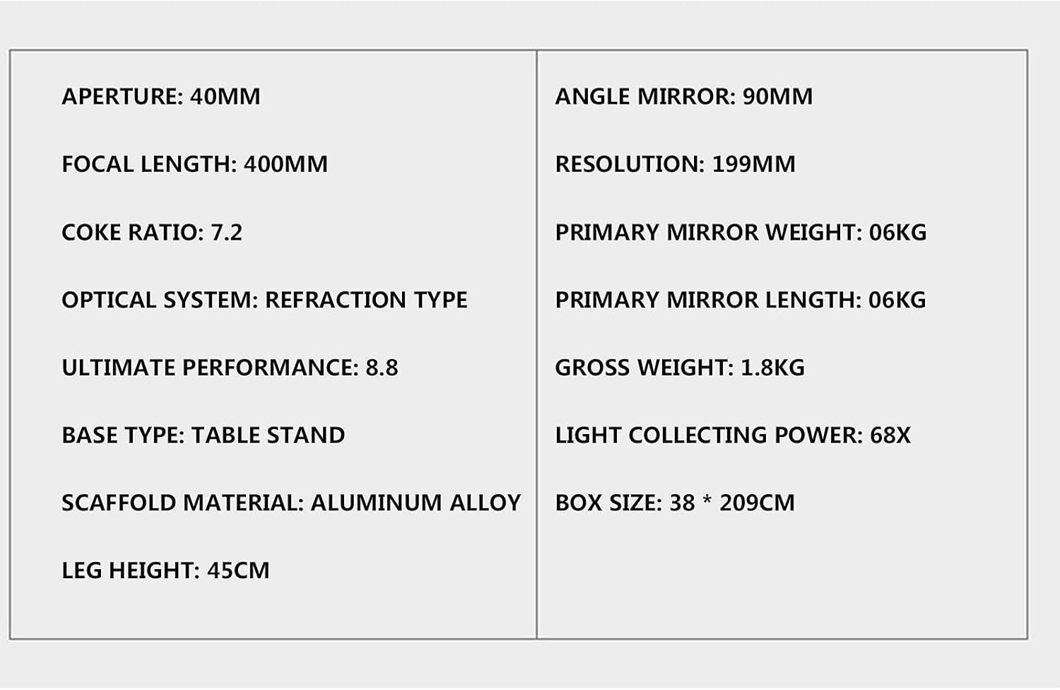 Feature: Telescope specifications Project Type: Desktop Astronomical Telescope Total magnification: 15X-45X Objective lens diameter: 60mm Focusing device: focal length 300mm 18mm eyepiece With lens cap and eyepiece cap Tripod height: 100mm Product weight: 1230g How to assemble the telescope (1) Extend the legs of the aluminum tripod to the maximum, until the center tube support is placed horizontally. (2) There is a mounting bayonet at the bottom of the telescopic lens barrel. Insert this mount into the slot on the top of the tripod. (3) Turn the knurled knob on the tripod head to tighten the tube around the tripod. (4) Screw the aiming control arm into the threaded hole on the back of the base (5) Place the diagonal mirror on the end of the telescope tube (6) Place the eyepiece in the diagonal mirror (7) Remove the cover from the big head of the telescope (8) Can be used now. Package Included 1 telescope 1 box 1 nylon backpack 1 tripod 1 manual (Does not include phone holder)