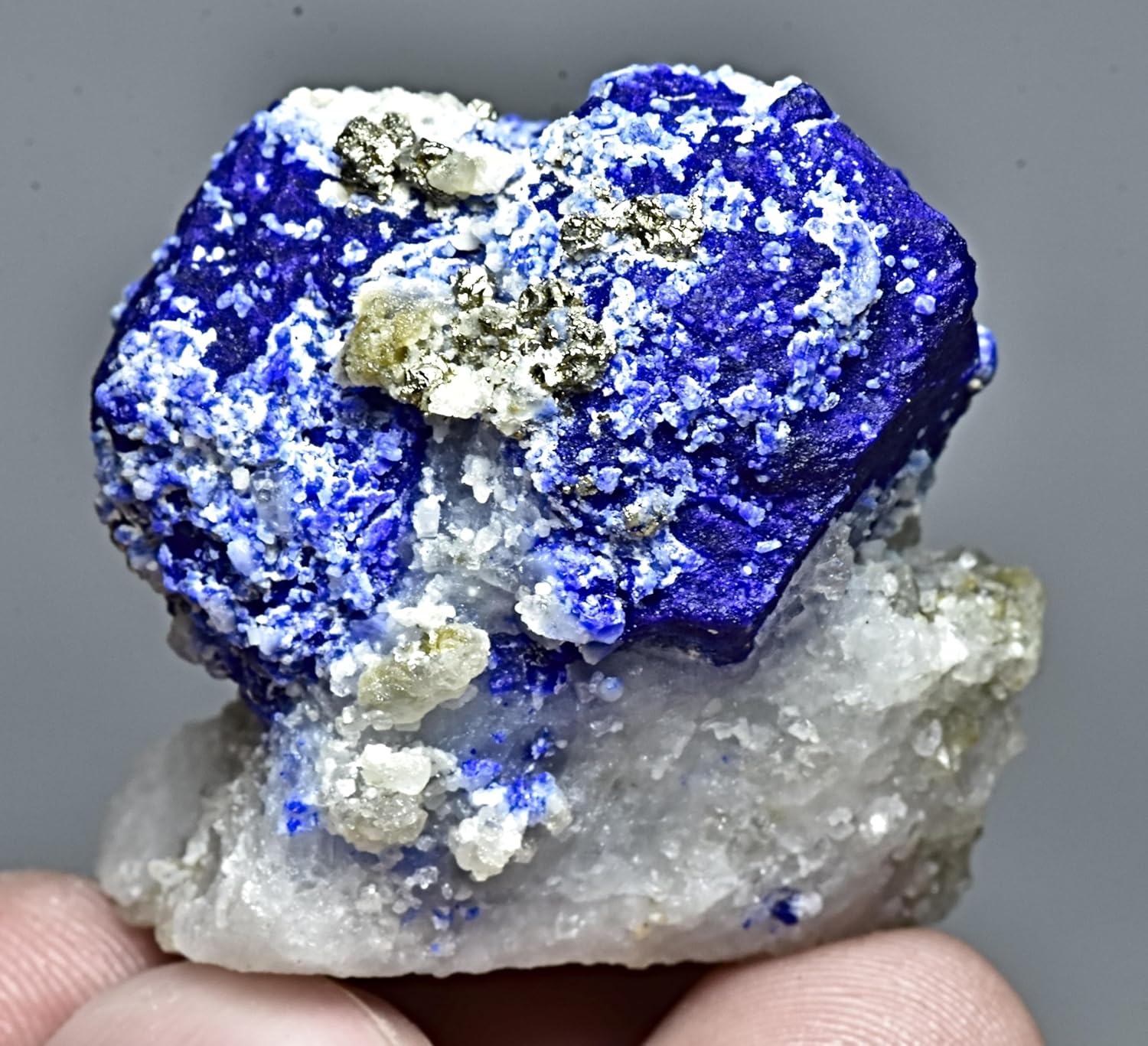 Quantity : 1 Type : Awesome Blue Color Lazurite crystal Specimen Combined With Forsterite & Pyrite Specimen Size : 37 mm x 34 mm x 26 mm Treatment = Natural Color : As shown Total Weight : 41 Gram Origin = Badakhshan Afghanistan