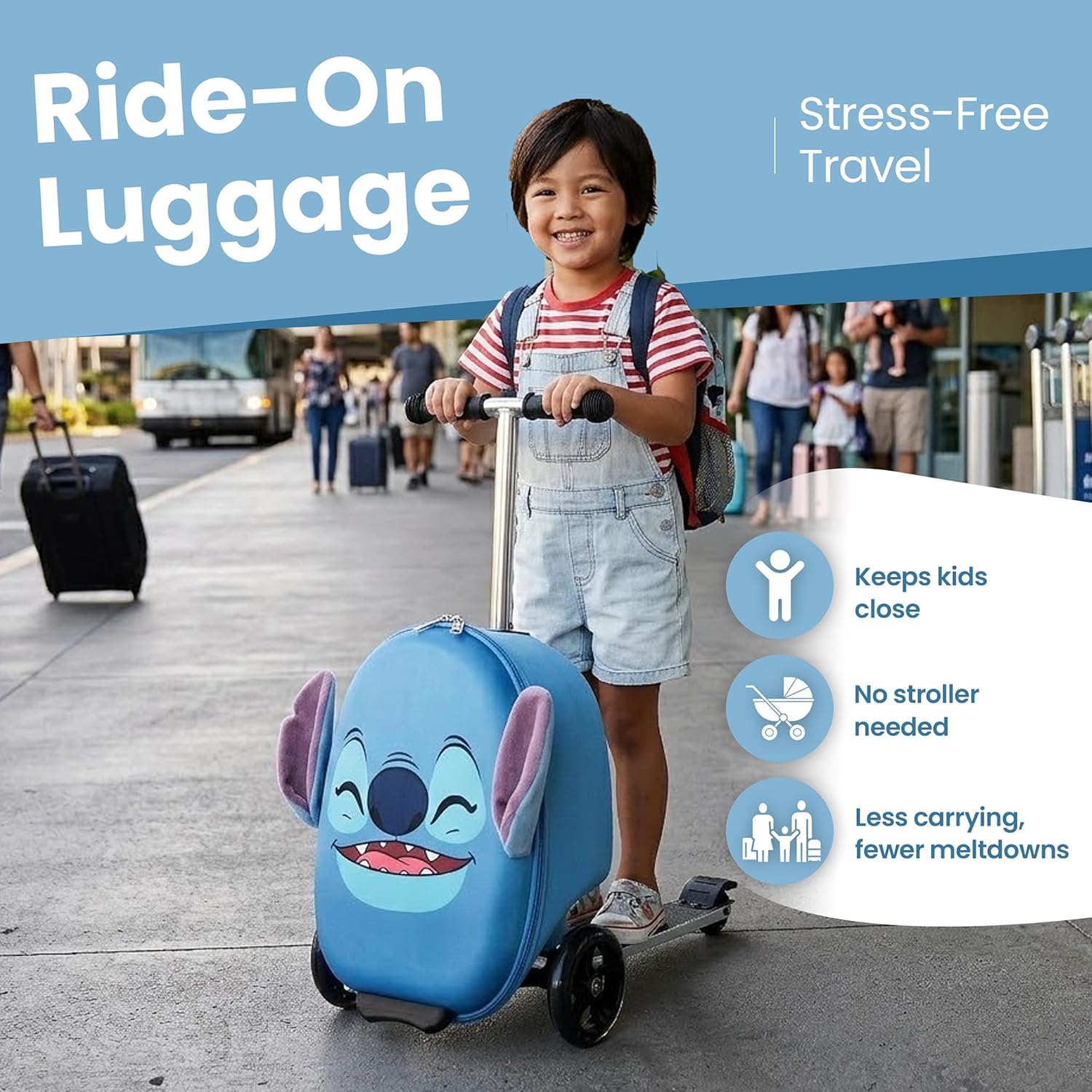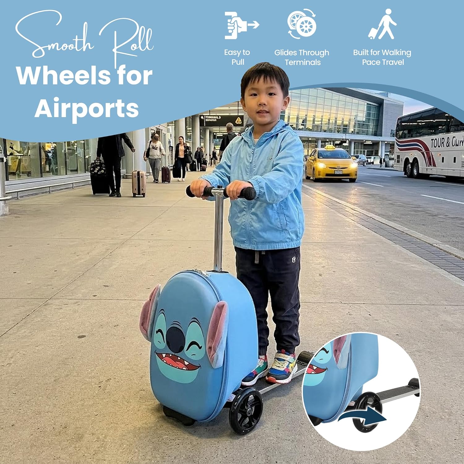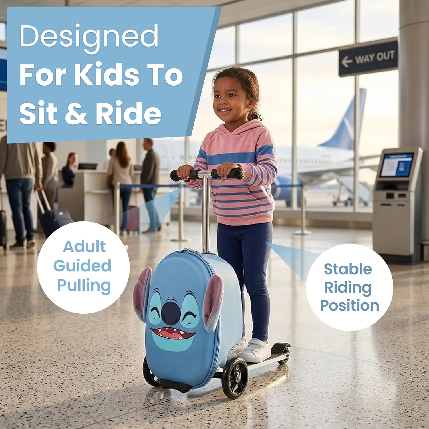 Make every trip feel like an adventure with this Lilo & Stitch ride-on luggage and scooter combo. Designed to look like Stitch with 3D ears, this playful suitcase captures attention wherever it rolls. It features three light-up wheels for extra fun, a fold-up scooter deck with a non-slip grip plate for easy riding, and interior valet straps to keep belongings in place. The exterior is crafted from shiny poly and EVA materials for lasting use, while retractable grip handles offer added convenience. Wipe it clean for easy care.
