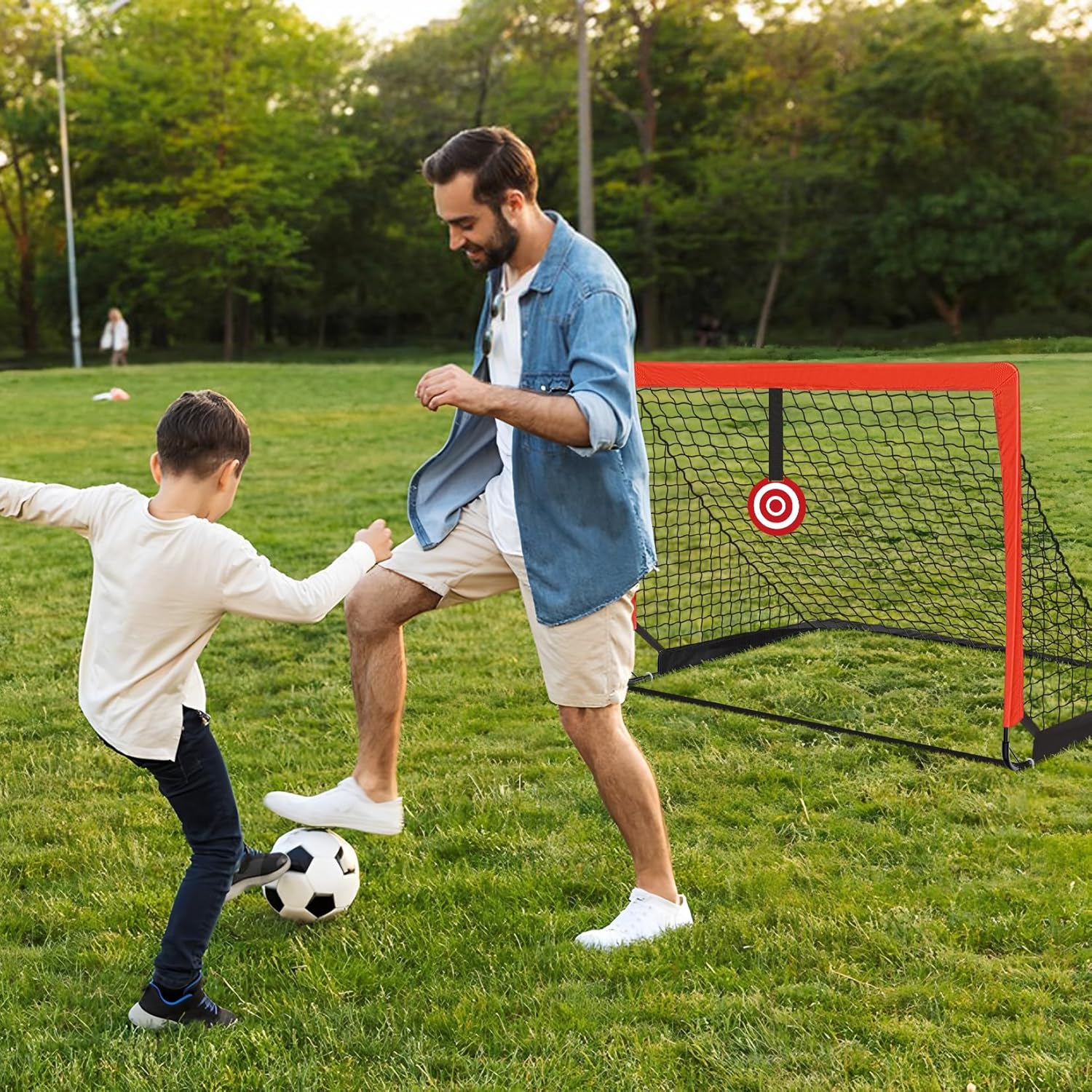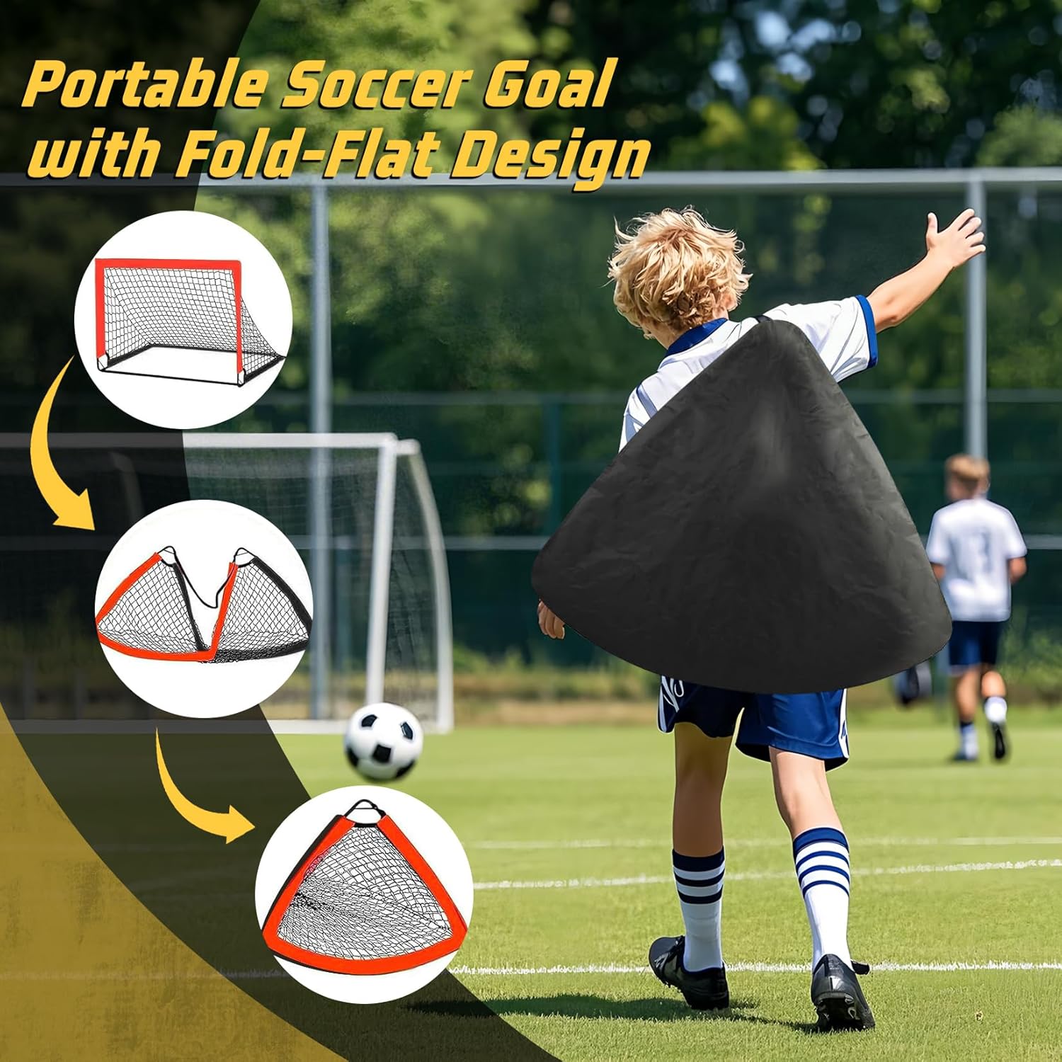 Youth football goal - foldable, portable, perfect for the garden. Key Features: STRONG LIGHTWEIGHT: Sturdy folding fiberglass frame with good elasticity. Easy disassembly and space-saving storage. High quality mesh: reinforced 3-strand polyester mesh with uniform mesh. The edge is made of high density 420D polyester for extra durability. Easy to install attachment: includes L-shaped metal connectors for tool-free assembly and 4 U-shaped pegs for secure attachment to the lawn. Training Target Cloth: The enclosed removable 4-hole target cloth promotes shooting accuracy and makes training even more varied. Product specifications: Dimensions (W x H x D): 120 x 90 x 90 cm. Material: fibreglass poles, polyester mesh, metal connectors. Suitable for: teenagers over 14 years Ideal for: garden, lawn, park, school yard. Box contents: 2 x football goals. 4 x U-shaped pegs. 1 x target centre. 1 x football. 1 x air pump. 15 x football cones. 1 x transport bag. 1 x assembly instructions. Tip: Perfect for youth football training, family games or improving shooting technique. After folding, the gate fits comfortably into the included carry bag.