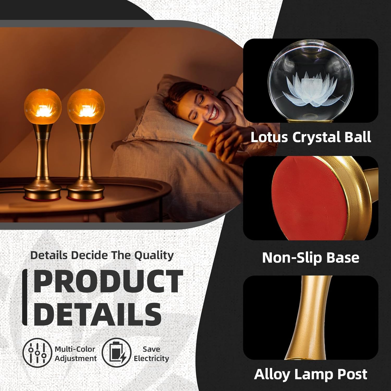 Color Crystal Lotus Lamp-LED Rotating Base Lotus Lamp Enhance the beauty and serenity of your space with our color crystal lotus lamp. This sophisticated lamp combines elegant design with captivating LED lighting to create a stunning decorative piece that fits any environment. Exquisite crystal design Our lotus lantern features a beautifully crafted crystal lotus flower symbolizing purity and enlightenment. The exquisite design and high-quality crystal material provide bright light reflections, making it a charming centerpiece for any room. Attractive color LED lighting The lamp features an LED light source that rotates through seven vibrant colors to create a soothing and captivating light show. The auto-color changing feature makes it perfect for relaxing, meditating and creating a peaceful atmosphere in your home. High-quality materials Made of high-quality crystal, this lotus lamp is both durable and beautiful. The crystal's high transparency ensures that LED light is perfectly refracted, creating a dazzling display. Versatile and elegant decoration Whether you want to beautify your living room, bedroom, meditation space or office, this crystal lotus lamp is the perfect choice. It also makes a thoughtful gift for a loved one, bringing a touch of beauty and serenity to any occasion.