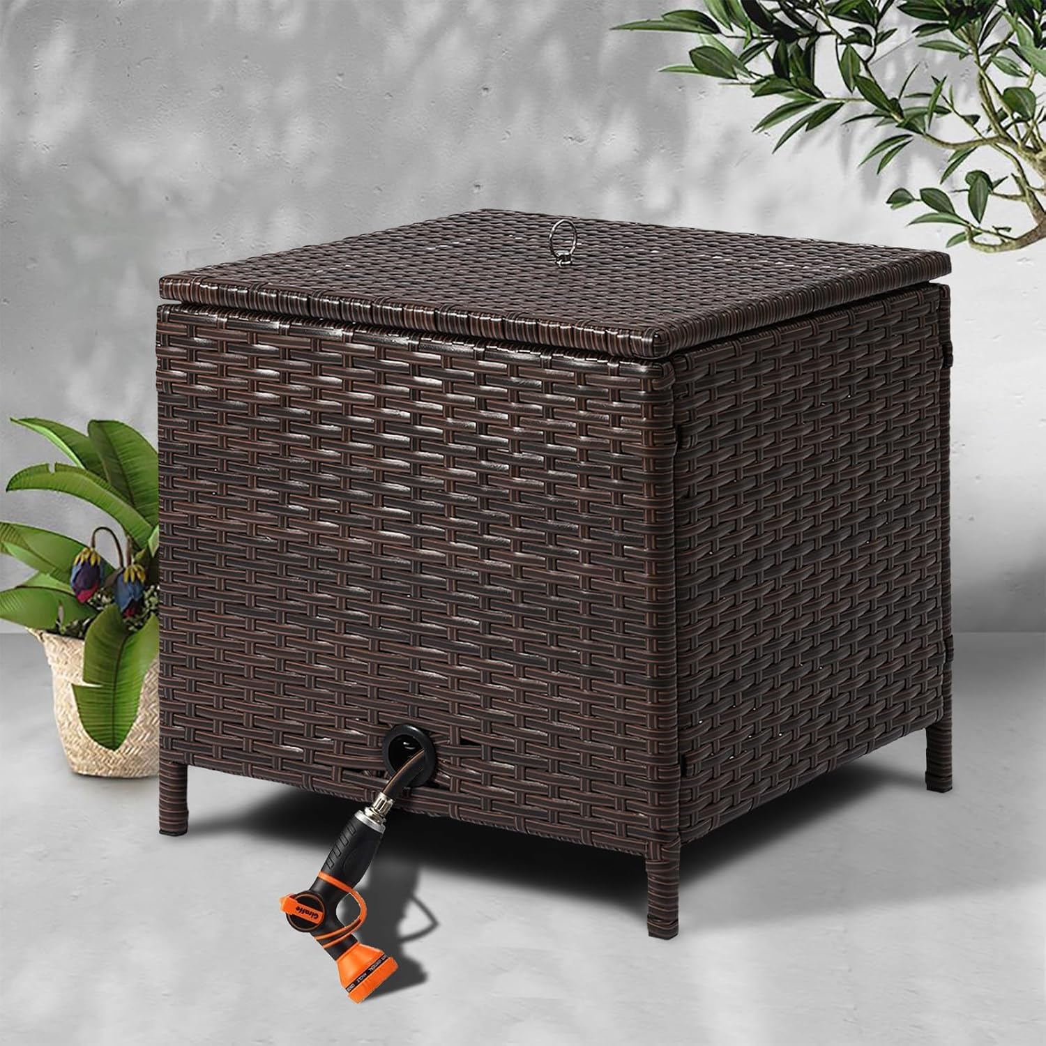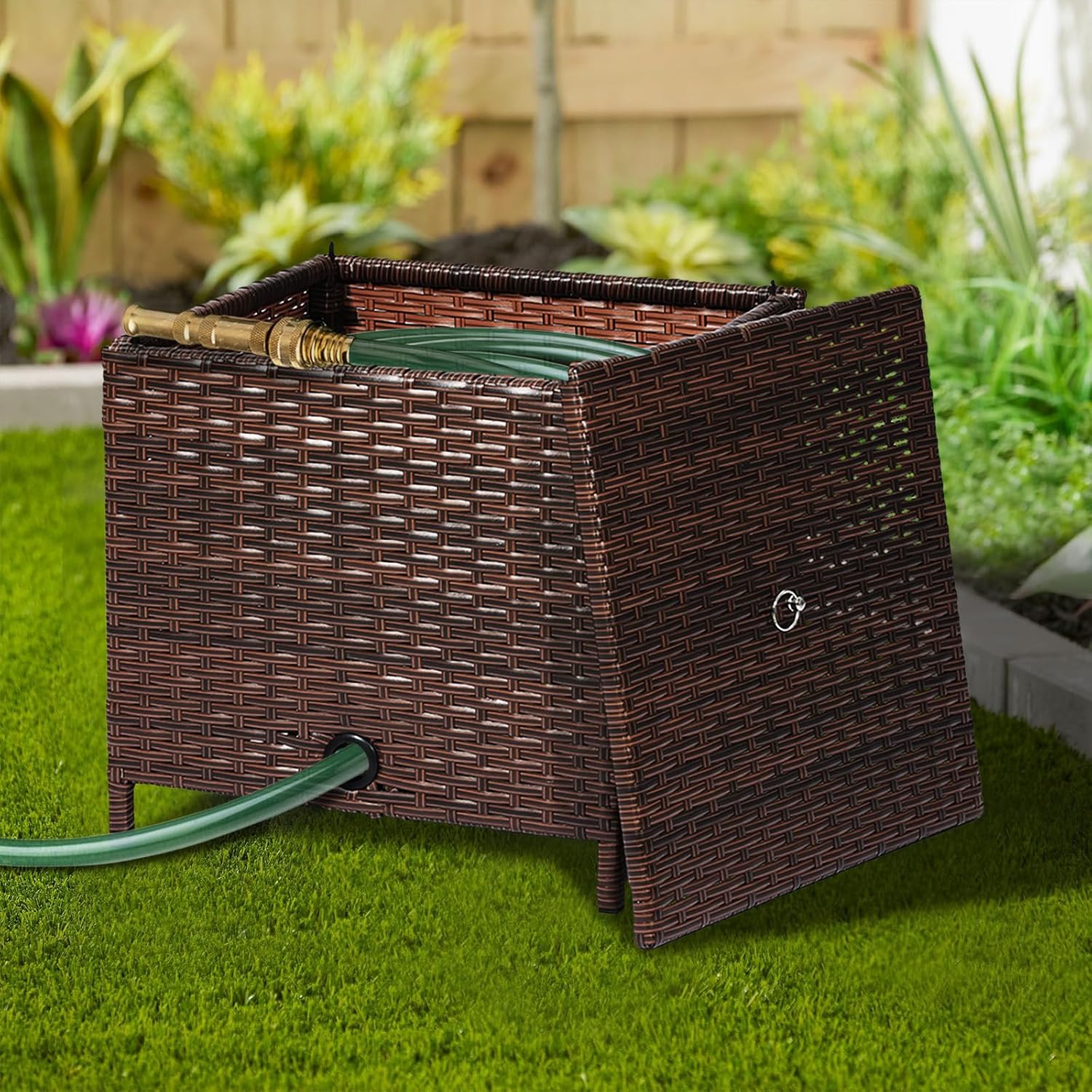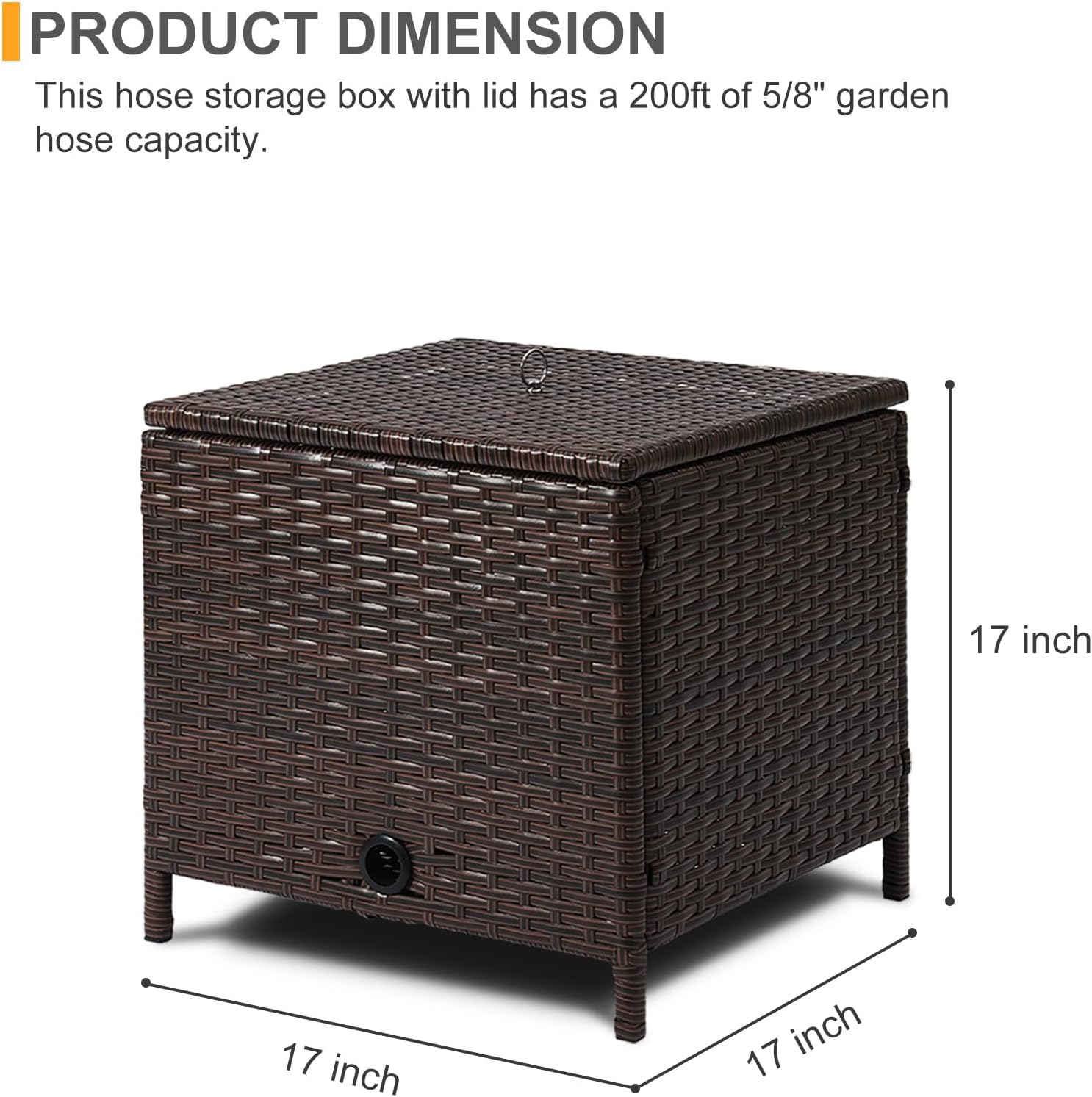 Includes a protective lid to shield your garden hose from dirt, debris, and UV exposure, prolonging its lifespan and functionality. Upgrade your garden organization with this reliable and stylish hose storage solution! Adds both beauty and functionality to your backyard, patio, veranda or back porch. This hose storage box with rattan decorative lid is the ideal choice for those who wish to enhance the rural charm of their garden. A hose holder is a great way to keep your garden looking neat and organized. This hose box can be used to store hoses, watering cans, garden tools, and other items that you need to keep out of sight. Measuring in at 17’’ L x 17’’ W x 17’’ H, this hose storage box with lid has a 200ft of 5/8" garden hose capacity. With the help of clear instruction, you can quickly install and secure our hose storage box