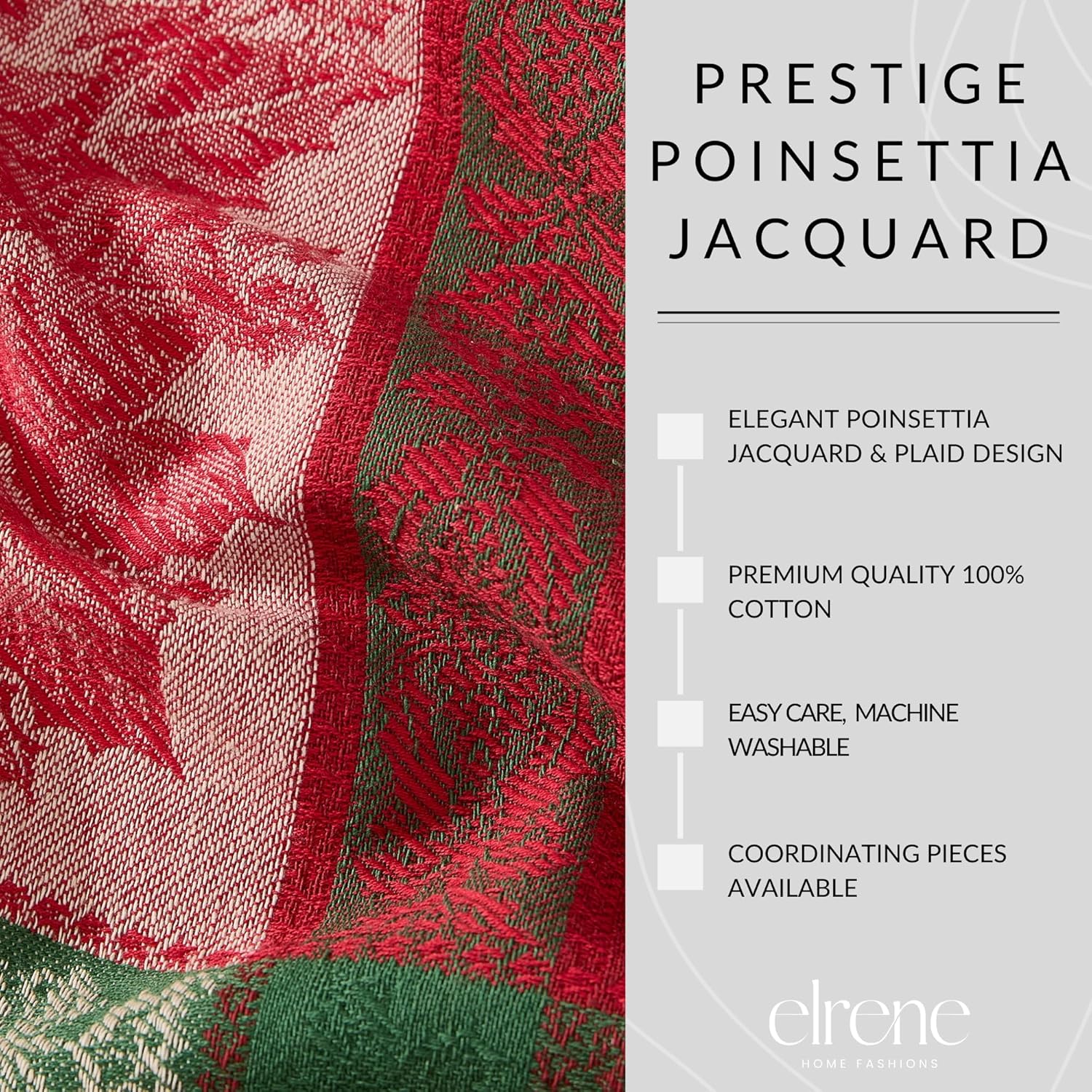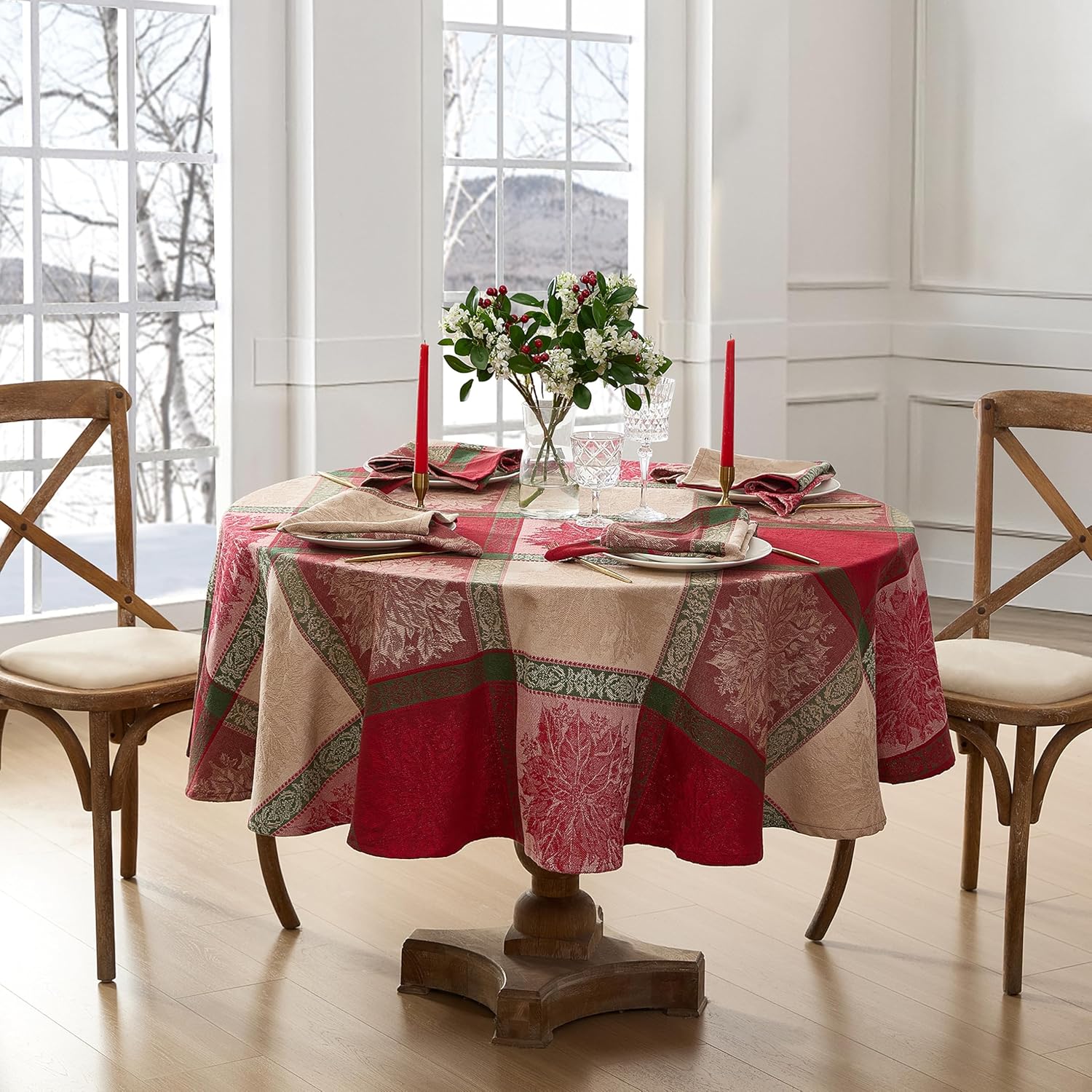 Add a festive touch to your traditional table setting this Holiday season with the Prestige Poinsettia Jacquard tablecloth. With its stunning poinsettia design and classic plaid pattern in tones of beige, red and green, our woven tablecloth is a favorite for seasonal gatherings, formal holiday events and celebrations, or everyday dining. 100% Cotton fabric offers an elegant drape and a lush feel, which becomes softer through time and use. Finished off with a delicately hemmed edge to provide a finished look and prevent wear and tear, this durable tablecloth is machine washable for easy care. Available in a large selection of table shapes and sizes, including rectangle, oval and round, we are sure to have the perfect fit for your everyday dining and seasonal entertaining needs. Designed to coordinate beautifully with a wide range of everyday and seasonal dinnerware. For a complete look, pair your tablecloth with our luxury table pad and matching Prestige Poinsettia Jacquard napkins.