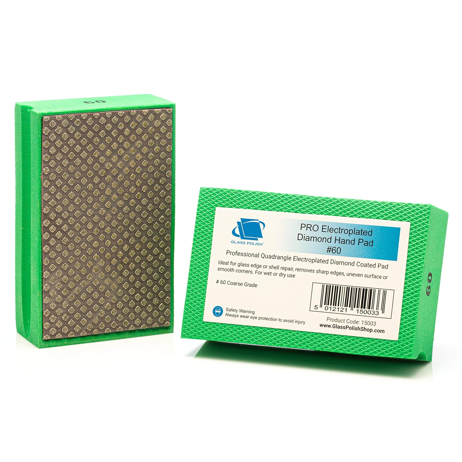 Versatile Diamond Hand Pad Bundle for All Your Sanding Needs – The GLASS POLISH PRO Diamond Hand Pad Bundle includes two 120 Grit (Black) and one 60 Grit (Green) diamond-coated foam sanding blocks. Designed for professional and DIY use, these ergonomic pads combine the cutting power of diamond with a comfortable grip, making them ideal for a wide range of applications on hard surfaces. Efficient Material Removal and Refinement – The 60 Grit (Very Coarse) pads are perfect for rapid material removal and tackling tough edges, while the 120 Grit (Coarse) pads provide efficient surface refinement and edging. Use them together to achieve smooth, precise results on glass, tiles, ceramics, concrete, granite, marble, and more. Advanced Design for Superior Performance – Each pad features a single electroplated cutting surface with micron-graded diamonds and an open quadrangle pattern to minimize clogging for faster sanding. The flexible backing conforms to uneven surfaces, ensuring consistent, high-quality results on every project. Perfect for Glass, Tile, and More – Whether you’re sanding sharp glass edges, refining tile cuts, smoothing concrete countertops, or removing rust and paint from metal, these pads deliver professional-grade results. They’re also excellent for pottery, drywall, and other creative or repair projects. Durable and Reusable – Built for longevity, these diamond hand pads are reusable and perform well in both wet and dry applications. With two pads of 120 Grit and one of 60 Grit, this bundle offers a comprehensive sanding solution for a variety of tasks.