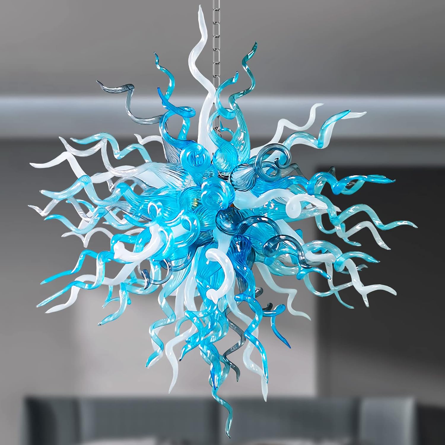 Long Description:Elevate your home decor with this stunning hand-blown Murano glass chandelier. Crafted with high-quality materials, this chandelier features exquisite shades made of hand-blown Murano glass that add an artistic touch to your living space. The stainless steel metal frame is durable and corrosion-resistant, making it perfect for long-term use.Not only is this chandelier beautiful, but it's also customizable to suit your personal style. Available in various colors and sizes, this chandelier is a perfect fit for any modern and Nordic style homes. Please contact us via Amazon message for a color chart and consultation.The iron chain can be adjusted up to 36 inches to fit your ceiling height and preference. The chandelier is equipped with G4 LED bulbs that offer three-color changing options. The bulbs are energy-saving and long-lasting, providing warm and cozy lighting for your living room, bedroom, or study. If you prefer brighter lighting, you can also choose to replace the bulbs with ones up to 40W or add a dimmer switch to create a more relaxing ambiance.Installation is easy with all necessary hardware and instructions included in the package. If you have any questions or concerns, our friendly and professional customer service team is available 24/11 to assist you.Experience the luxury of this hand-blown Murano glass chandelier and add a touch of elegance to your home.
