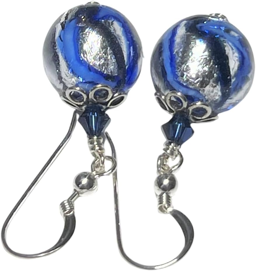These exquisite Italian Murano glass earrings are a testament to timeless craftsmanship. Handmade with genuine Murano beads, each bead is meticulously crafted over an open flame, ensuring every pair is one-of-a-kind. The 12mm beads feature mesmerizing swirls of blue that appear to float in water, with sterling silver foil encased within the glass for added depth and shimmer. To complete the design, I used sterling silver findings and accented the earrings with blue crystals. The beads are wire wrapped for extra security, and the earrings measure approximately 1.6 inches from top to bottom. Choose from sterling silver fishhook, sterling silver leverback, or silver-plated screw clip-on options for non-pierced ears. These earrings come beautifully packaged in a gift box, making them perfect for any special occasion.