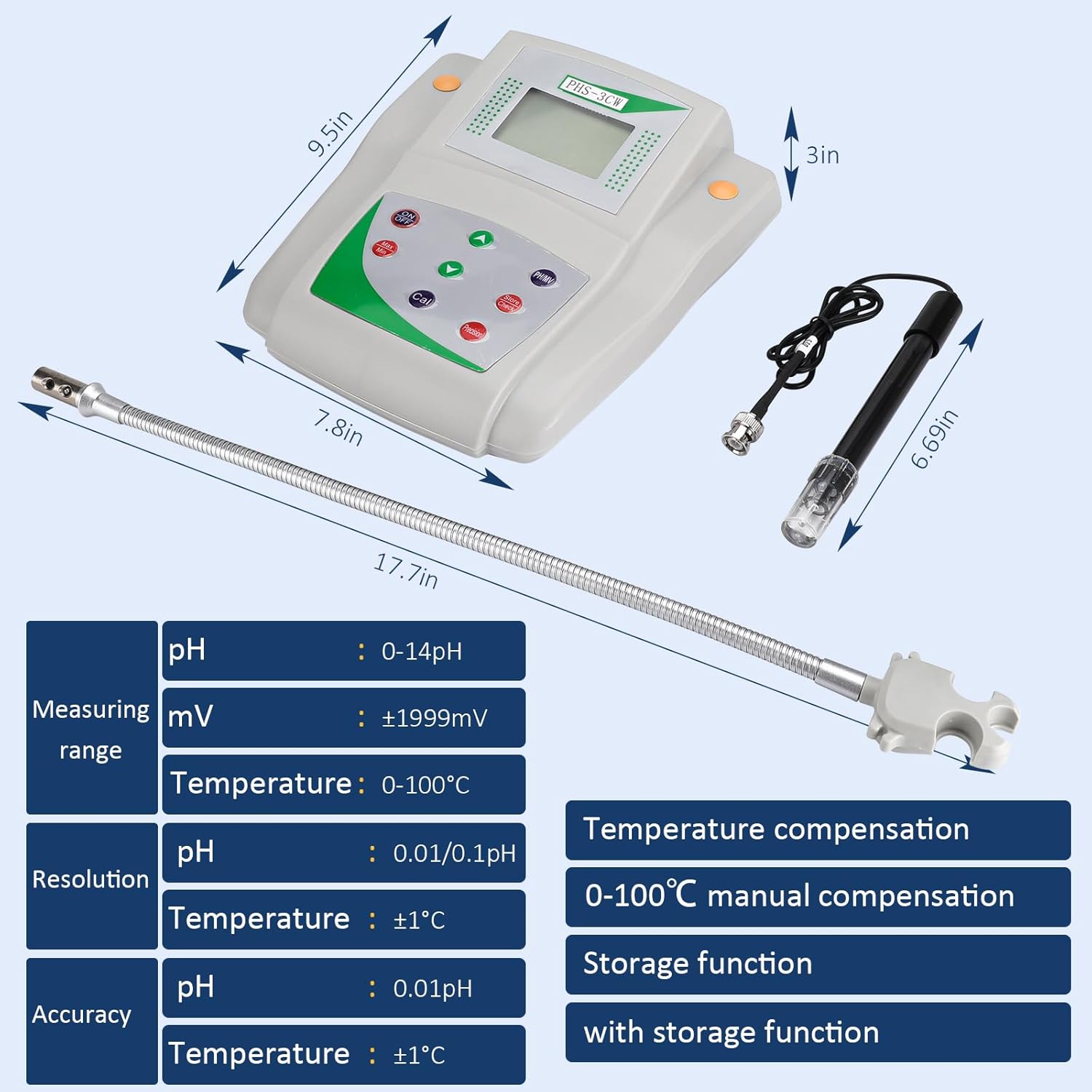 Description:Scientific LCD Display Benchtop pH-mV Meter does not include PH standard calibration specimens, which need to be purchased separately upon receipt of the package.Features:Measurement range:pH: 0 to 14.00pHmV:±1999mVTemperature: 0 to 100°CResolution:pH: 0.01/0.1pHTemperature: ±1°CAccuracy:pH: 0.01pHTemperature: ±1℃Temperature compensation: 0-100℃ manual compensationStorage record: with data storage functionDimension: 230×200×60mmWeight: 1.2KgService: If you have any questions you can always contact us, and we provide you with 30 days free return service