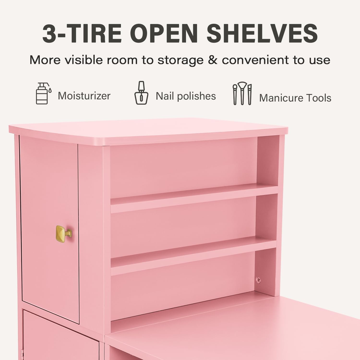 Organize your nail salon with style and function using this elegant and practical manicure nail table—perfect for professional nail technicians or at-home beauty stations. Available in chic color combinations like Black Gold, White Gold, Pink Gold, and Gray Gold, this nail table is designed to bring a clean, modern aesthetic to any space.Stay organized with ample storage options: three spacious drawers with gold-tone handles on the right, a large cabinet on the left with three pull-out trays for storing tools or polish, a small upper cabinet, and three desktop shelves for easy access to daily essentials. An open shelf beneath the tabletop provides additional room for towels, bottles, or devices.What makes this table stand out is the built-in power strip on the side, offering 2 standard power sockets and 2 USB ports to keep your nail drill, UV lamp, and phone charged and ready. Supported by sturdy metal legs, this nail tech desk is both durable and stylish.Whether you're working in a nail salon, spa, or home studio, this manicure table blends fashion with functionality—making it a must-have for any beauty space.