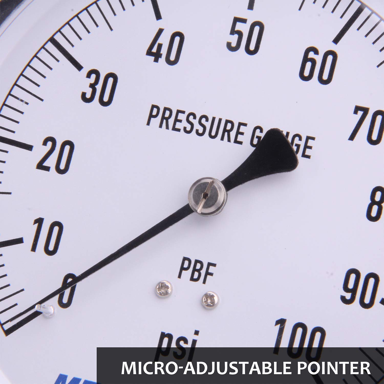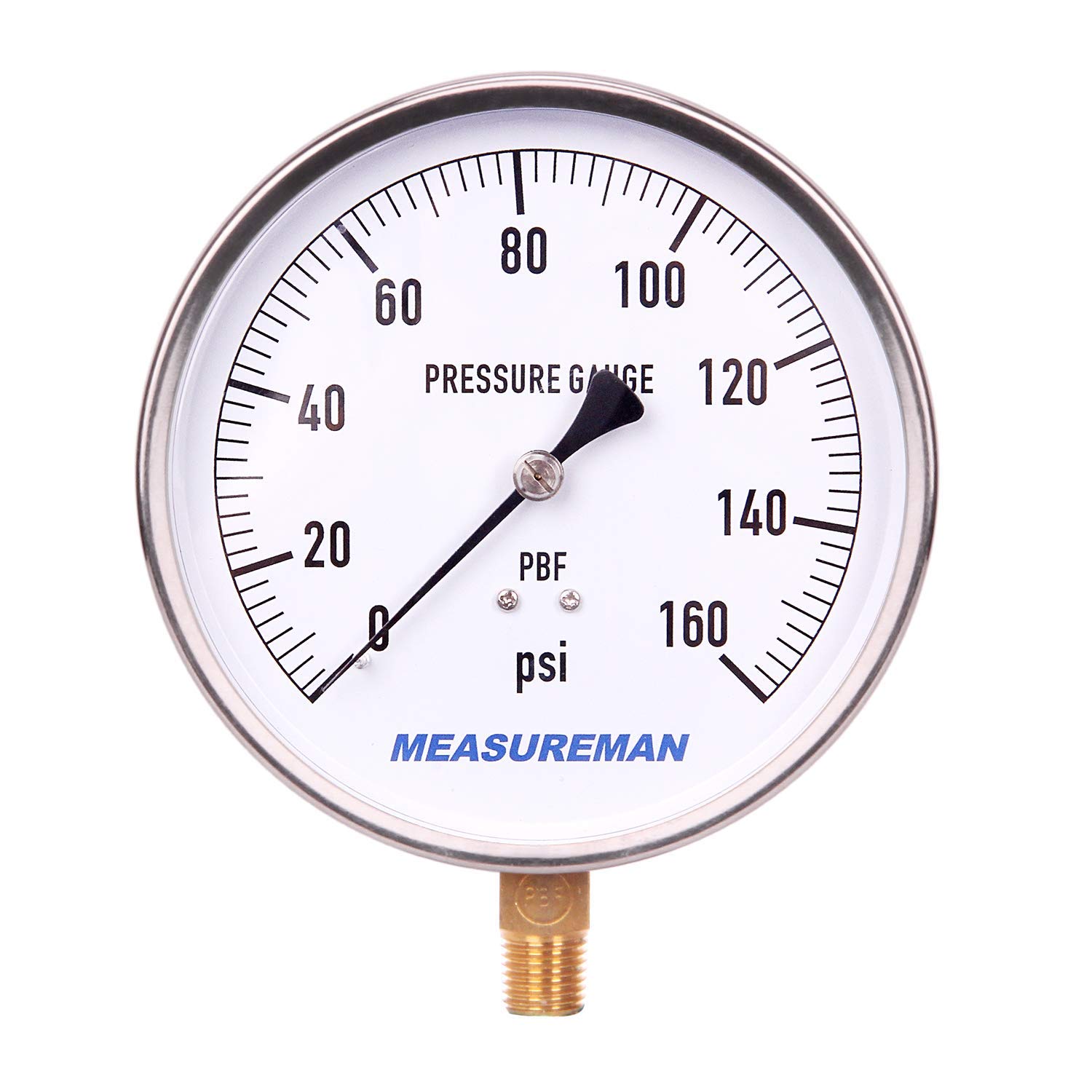 Description "This 4-1/2"" dial size gauge is designed for contractors, which is used for measuring of the water and air pressure in the Heating, Cooling, Ventilation and Cooling Industries. It is also available for drinking water system. The 4-1/2"" large dial size, is easy to see from distance. Process connection: 1/4""NPT male lower mount This gauge is made with Lead Free wetted parts according to California AB 1953 standard and 2014 US Safe Drinking Water Act. Lead Free brass connection, Lead Free bourdon tube, Lead Free solder. Case: 304 stainless steel case and bezel ring Window: Polycarbonate Dial plate: aluminum, with pointer stop Pointer: Aluminum, black, DIN style, adjustable Bourdon tube: Copper alloy Movement: Brass Connection: Brass, PBF marked IP class: IP43 Accuracy:+/-1%, Pressure range: 0-100psi & 0-160 psi Working temperature:-40 to 140 deg F/-40 to 60 deg C Ambient temperature:140 deg F/60 deg C maximum Measureman has 20 years rich experience in the measuring of pressure, temperature, flow, level industries, The "Measureman" branded products are the combination of continuous good quality and affordable price. "Measureman" products are selected and designed by professional engineers.