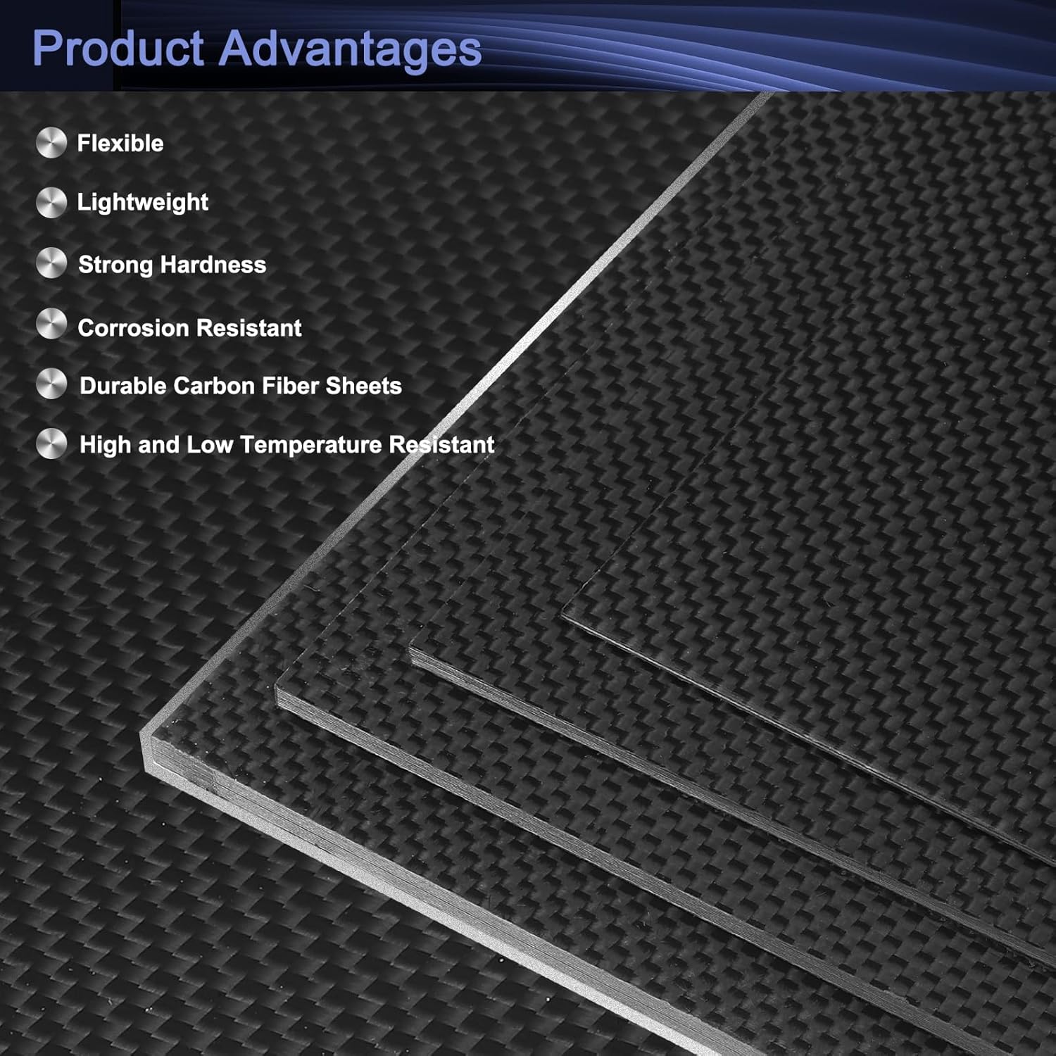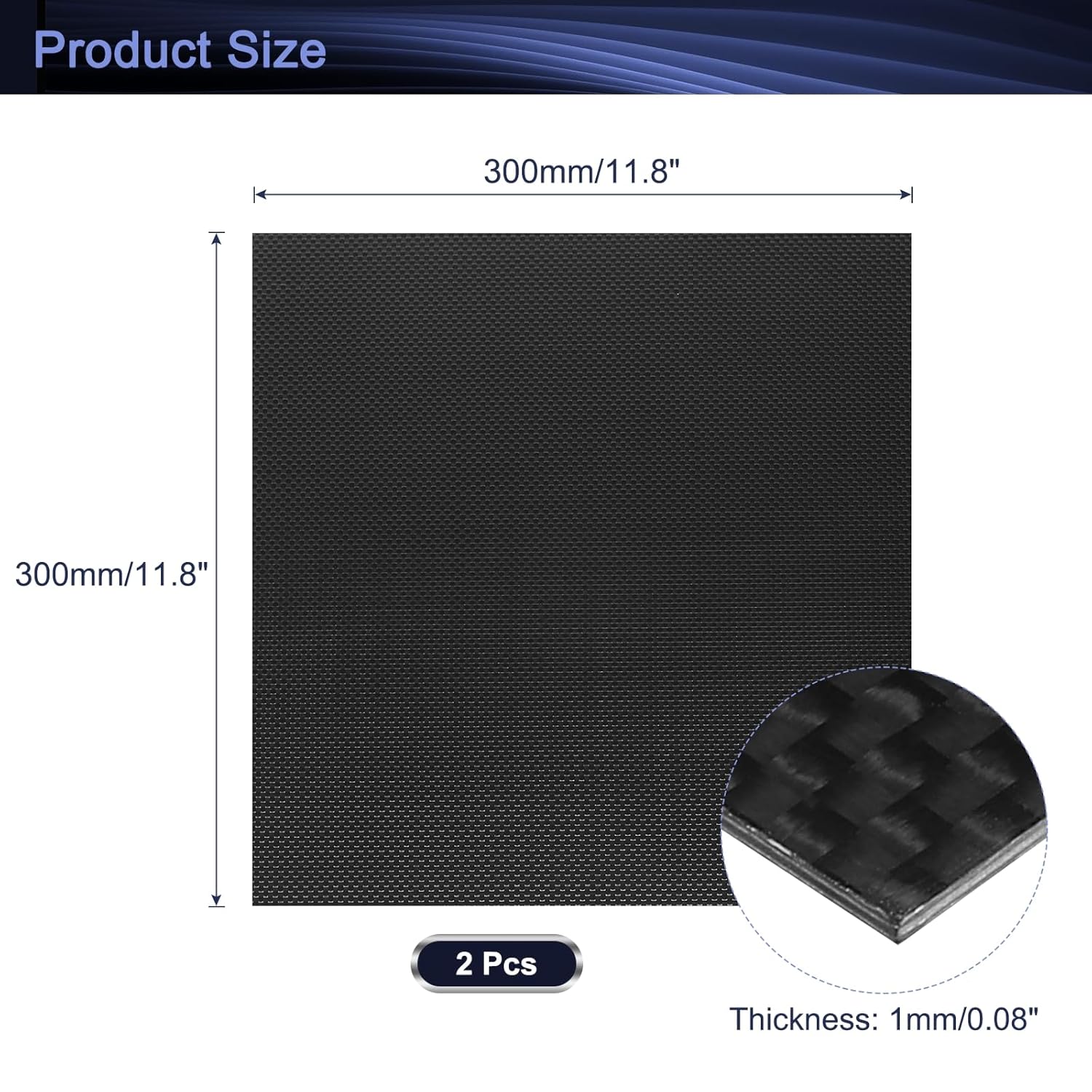 What is this? Widely used in RC aircraft, car models, mechanical parts, auto parts, furniture and home appliances, drones, electronic digital and other places.What will I get?Color: BlackMaterial: 3K Carbon FiberTotal Size: 300 x 300mm/11.8 x 11.8 inch (L*W)Thickness: 2mm/0.08 inchIn the package of: 2 Pcs x Carbon Fiber BoardAre there any advantages of the product?1. Durable Material: Strong hardness, lightweight, flexible, corrosion-resistant, high and low temperature resistant.2. Smooth Edge: Precision cutting, the edges of the carbon fiber sheets are smooth and burr-free.How to use it?1. Ensure that the surface where you will be applying the carbon fiber sheet is clean and free from any dust;2. Measure the area where you want to apply the carbon fiber sheet and cut it accordingly using a utility knife or scissors;3. Use an adhesive to secure the carbon fiber sheet to the surface if needed;4. Carefully place the carbon fiber sheet onto the surface, aligning it correctly.What should I notice? Please allow slight errors due to manual measurement.