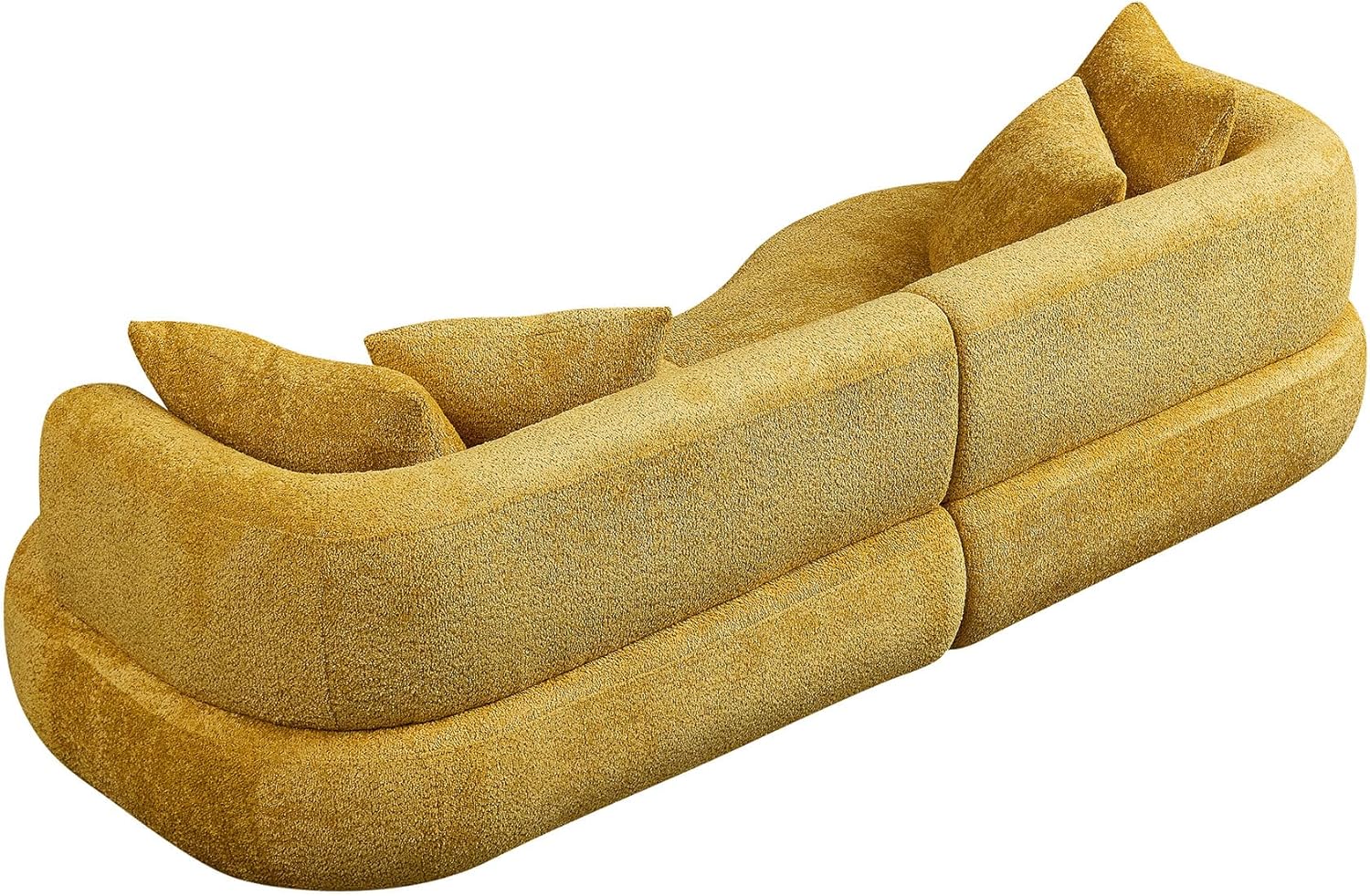 Transform your living space with this Amazing modern curved loveseat sofa in a rich mustard yellow. The contemporary design features an elegant curved silhouette and deep depth, comfortable seating that invites relaxation. Upholstered in luxurious boucle fabric, this sectional sofa combines style with exceptional comfort. The minimalist aesthetic is perfectly balanced by the sofa's generous proportions and plush cushioning. Multiple throw pillows add both support and visual interest, while the chaise section offers the perfect spot for lounging. The sophisticated mustard yellow color adds a bold yet refined accent to any living room, while complementing both modern and transitional decor styles. The premium upholstery texture creates visual depth and interest while providing durability for everyday use. This semicircular works beautifully as a focal point in your living space, offering both outstanding comfort and contemporary elegance.