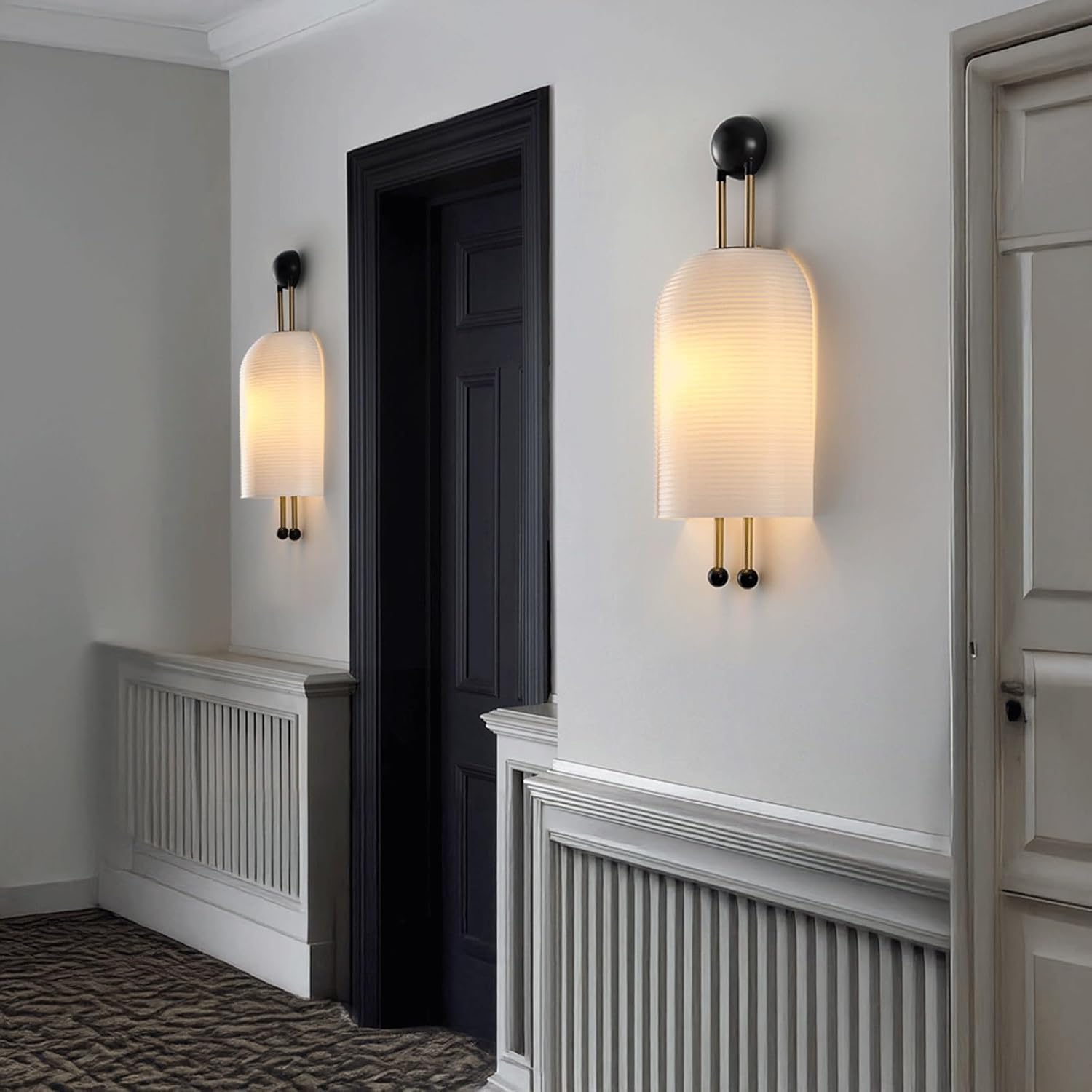 Product Parameters:Type: Wall Sconce / Wall LampStyle: Modern Minimalist, Contemporary, Decorative, Ambient Lighting, Nordic, Modern, Art Deco, Geometric, ElegantMaterial: Metal (frame, accents - antique brass finish, black decorative spheres), Glass (bell-shaped shade - white ribbed)Color: Antique Brass Finish (metal structure), Black (decorative spheres), White Ribbed (glass shade)Dimensions:Overall Height: 22.8" (58cm)Overall Diameter: 9.1" (23cm)Socket Type: E27Number of Bulbs: 1Bulb Included: NoOptimized Special Feature: This modern minimalist 1-light wall sconce features a distinctive bell-shaped white ribbed glass shade, elegantly suspended by antique brass finish metal rods and accented with minimalist black decorative spheres at the and bottom. Designed to accommodate one E27 bulb (not included), it casts a soft, diffused illumination, creating a subtle and inviting ambiance. Its blend of contrasting colors and textures with a clean, geometric form makes it a versatile and decorative light source, ideal for hallways, living rooms, bedrooms, or dining rooms, enhancing a contemporary, Nordic, or Art Deco-inspired décor.Applicable Space: Ideal for Hallway, Living Room Wall, Bedroom Bedside, Dining Room, Entryway, Study Room, Office, Hotel, or other spaces desiring modern decorative lighting.