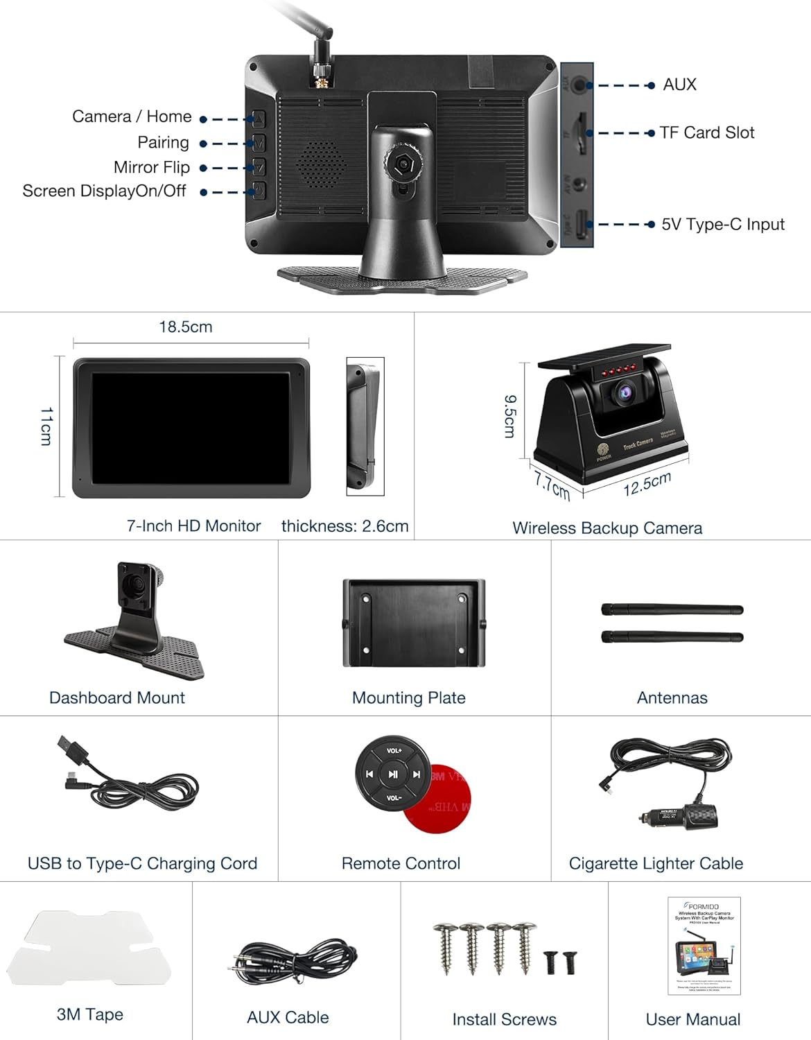 | BuiltIn Media | 7-Inch Monitor, Antennas, Remote Control, Charging Cables, AUX Cable, Magnetic Solar Backup Camera, Mounting Brackets, User Manual |
