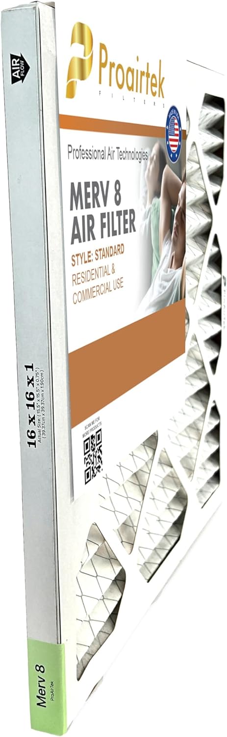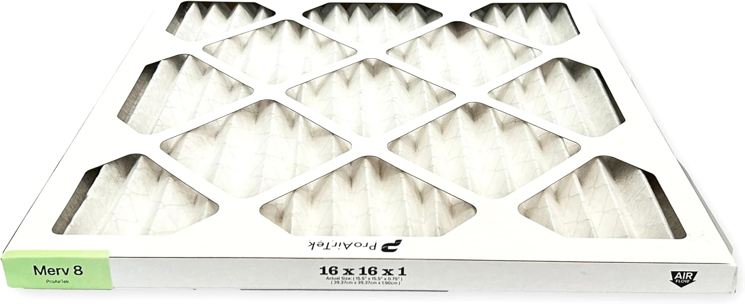 Proairtek AF16161M08SWH Model 16x16x1 Pack of 6 Air Filters, MERV 8; Ideal for Anyone Wanting Clean, Crisp Air in Their Home Key Features: - Pack of 6 Air Filters - MERV 8 - Ideal for Anyone Wanting Clean, Crisp Air in Their Home - Offers Enhanced Airflow and Efficiency - Better Capture Coverage, and Provides Consistent, High-Performance Filtration Specifications: - Item Dimensions: 16 x 16 x 1 inches