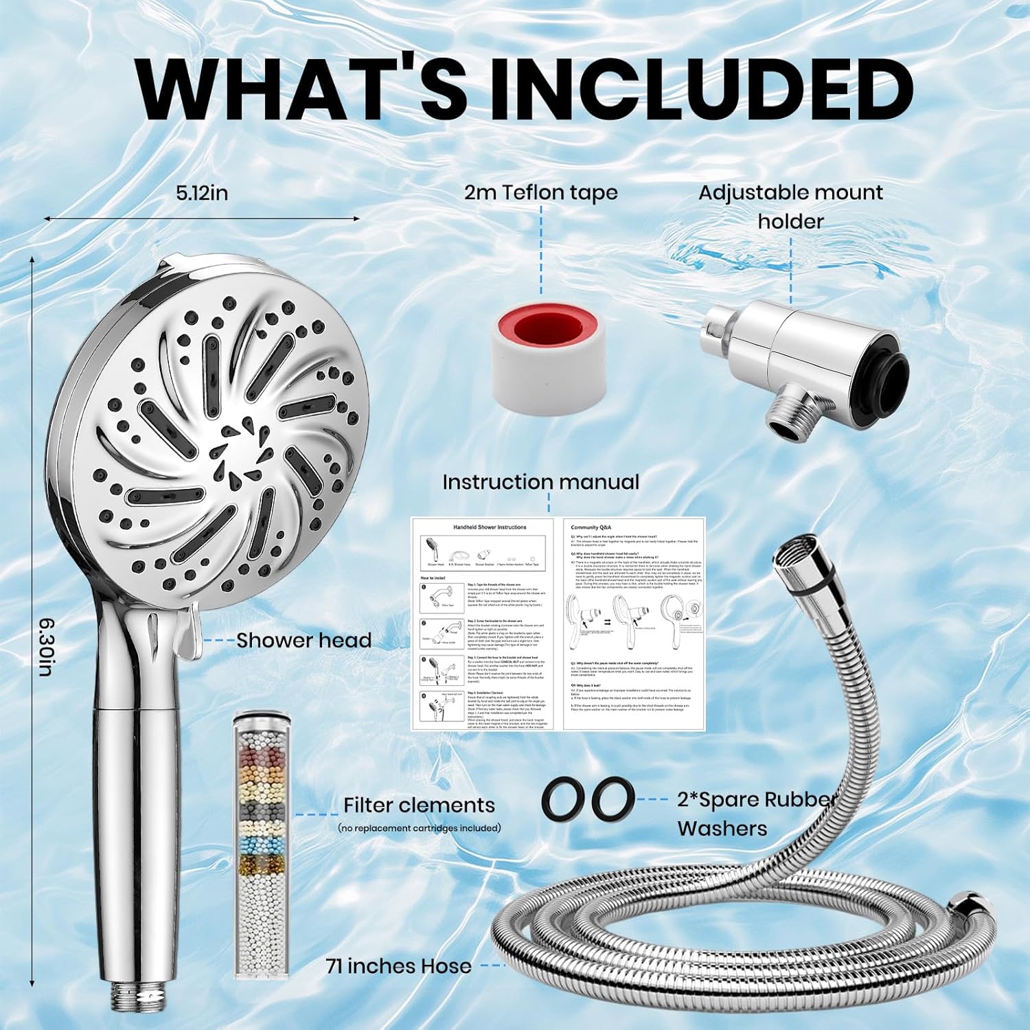 | Included Components | 1* Handheld Showerhead, 1* Stainless Steel Shower Hose, 1* Shower Bracket, 1* Filter Cartridge (Pre-installed), 1* Fluorocarbon Tape, 2* Rubber Gaskets, 1* Installation Guide |