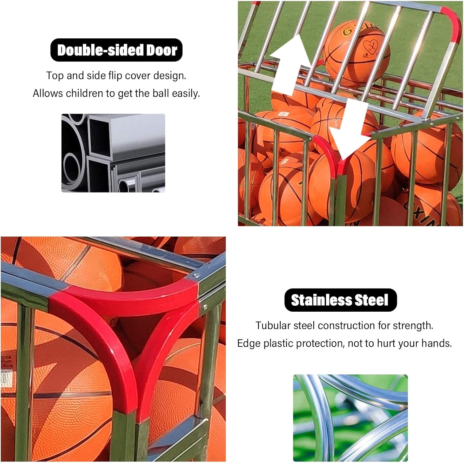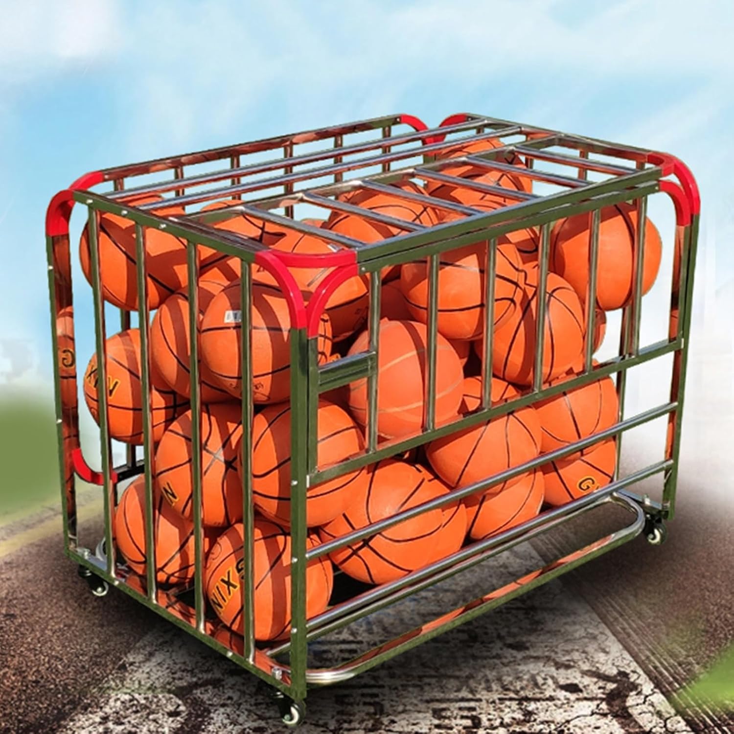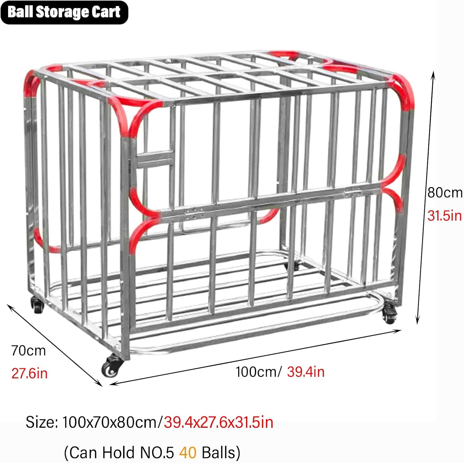Introducing our versatile Metal Storage Rack, designed to meet all your organizational needs while adding a touch of style to your space. This durable storage solution is crafted from high-quality stainless steel with a powder-coated finish, ensuring long-lasting performance and resistance to rust and corrosion. With dimensions of 100x70x80cm (39.4x27.6x31.5in), this spacious rack can hold up to 40 soccer balls and is perfect for a variety of sports equipment including baseballs, footballs, volleyballs, basketballs, and hockey sticks. Its high load capacity of 170kg (374 lbs) makes it an ideal choice for schools, garages, or home use. Designed for convenience, our storage rack features easy assembly, making set-up a breeze. The large rolling storage cart is equipped with rotating casters and brakes, allowing for effortless movement and secure placement wherever you need it. The edges are protected with red plastic guards, ensuring safety and durability. This waterproof and dustproof organizer is not only practical but also easy to clean, providing a hassle-free experience for busy families and sports enthusiasts alike. Included with your purchase is a special long lock with a matching key, offering added security for your valuable sports gear. Whether you're looking to declutter your garage, organize your sports equipment at school, or store garden tools, this metal organizer rack is the perfect solution. Elevate your storage experience today and enjoy a more organized, efficient space! (Note: Color may vary slightly from the images shown due to different display settings.)