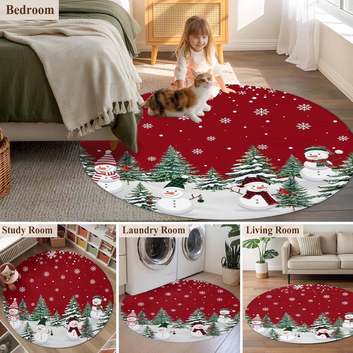 ★Incredibly durable polypropylene fiber, adding to rug longevity. Ensures premise design & vivid colorsbound edges help with ruglongevity & durability. Delicately designed Christmas rugs are perfect for indoor and outdoor decoration, adding a festive touch to your Christmas and making good memories for everyone. Shape: Round Backing: Non-skip rubber points. Package includes: 1 pcs x Christmas Themed Area Rugs Multipurpose & Christmas Decoration This is a perfect addition to create a cozy area or comfy room, give you a really nice touch and looks great in your room. Nice softness makes the rugs adapt to most indoor areas, Includes but is not limited to the following areas, baby nursery, bedroom, girls room, boys room, student dorm room, kids room, living room, playroom, apartment bedroom, themed room, office, beauty room, children play area, classroom reading area, in front of the sectional couch and love seat, under coffee table, small little space, cover the carpet, cover the tiled floor or hardwood floors, makes the whole room more cheerful and inviting. Each interior rug has a unique design with a high-definition print, colorful and bright. The Christmas pattern design never fades, creating a gorgeous and chic timeless image. A perfect gift for Christmas, New Years, Birthdays and more.