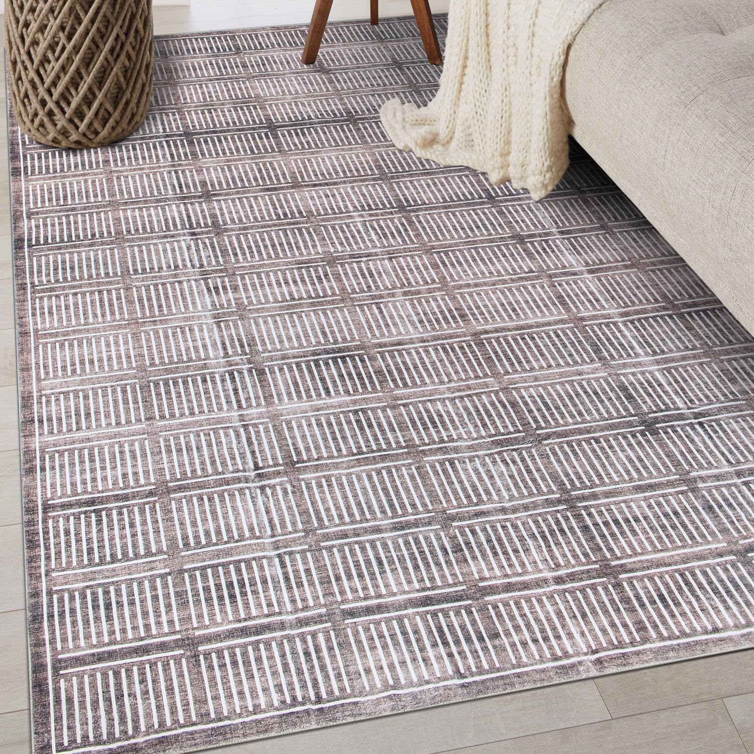 Step into modern sophistication with this geometric area rug, where crisp lines and bold contrasts create a visual statement. Crafted from plush yet durable polyester fibers, it delivers a soft, cozy feel underfoot while being built to withstand the demands of a busy home. With its machine-washable convenience and non-slip backing, this rug is a perfect blend of style and function.