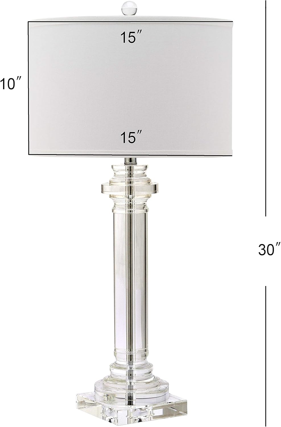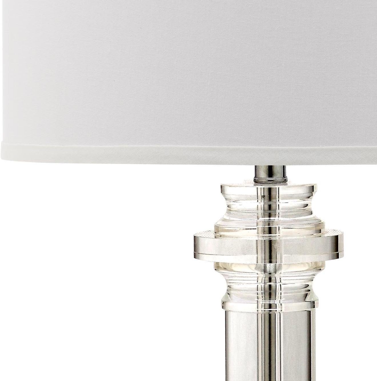Balance and symmetry inform the shape of the classic Nina crystal column lamp, but when done up in clear crystal and white shade it gets a modernized twist. A see-through, rounded pillar-like design and visible chrome neck dress up any room in the home.