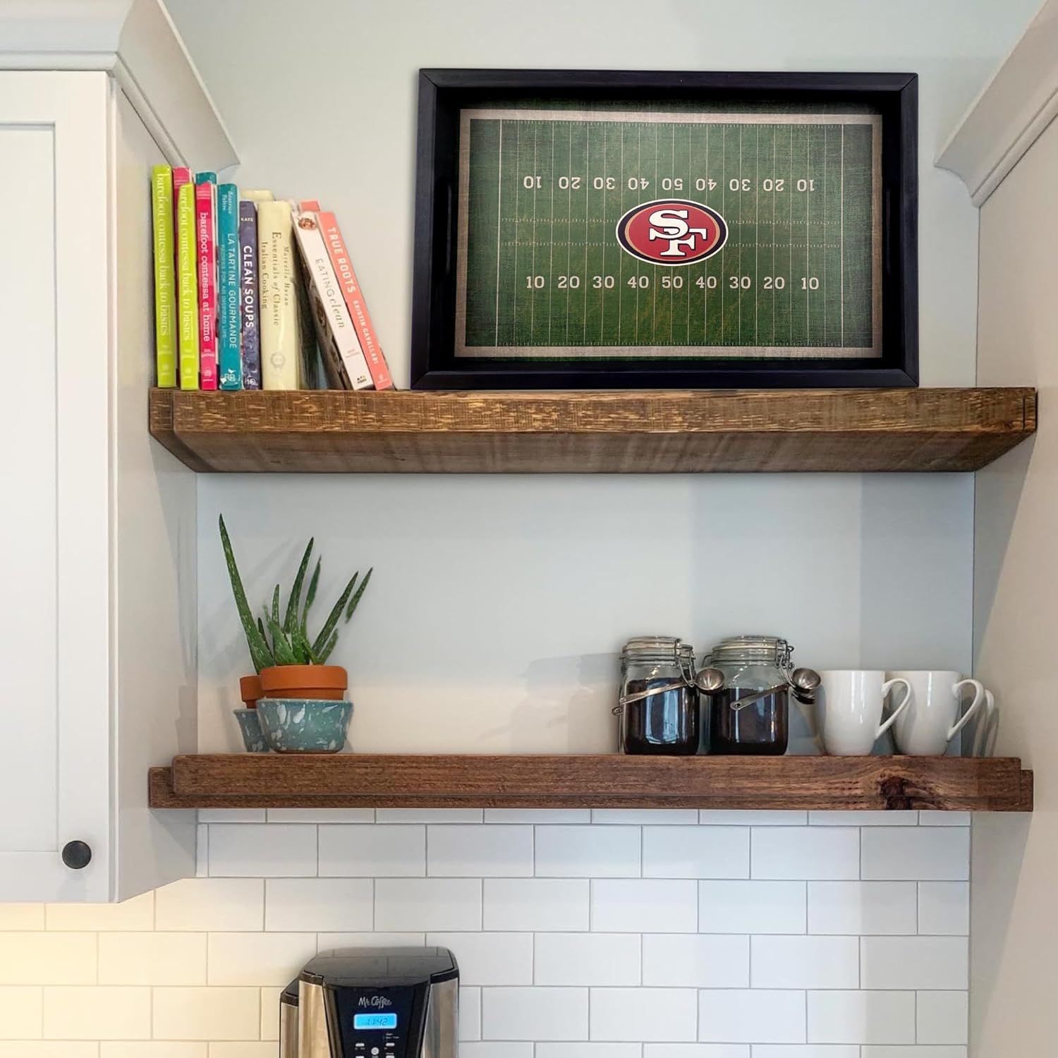San Francisco 49ers NFL Football Field Wooden Tray by Fan Creations - Decorative Team Logo Server with Handles for Food & Drink - For Game Day Entertaining or Tabletop Organizer - Show Your 49ers Pride Add to your San Francisco decor in your home! Made from high quality medium-density fiberboard, this San Francisco 49ers field tray is the perfect way to liven up gameday while staying well-supplied with your favorite snacks and drinks for all four quarters. The helpful handles and stylish wooden pattern are just as sure to turn heads as the print of the field, and solidify your status as a serious 49ers fan. In the offseason, this tray is an excellent tool in the den or mancave to keep your television remotes, video game controllers, and other multimedia devices organized on your coffee table, or as a home for your keys and mail by the front door, letting your guests know from the moment they walk in, to the moment they sit down who your team is. Not intended for food to be placed directly on the tray. Tray measures 19.75in x 12.25in x 2in