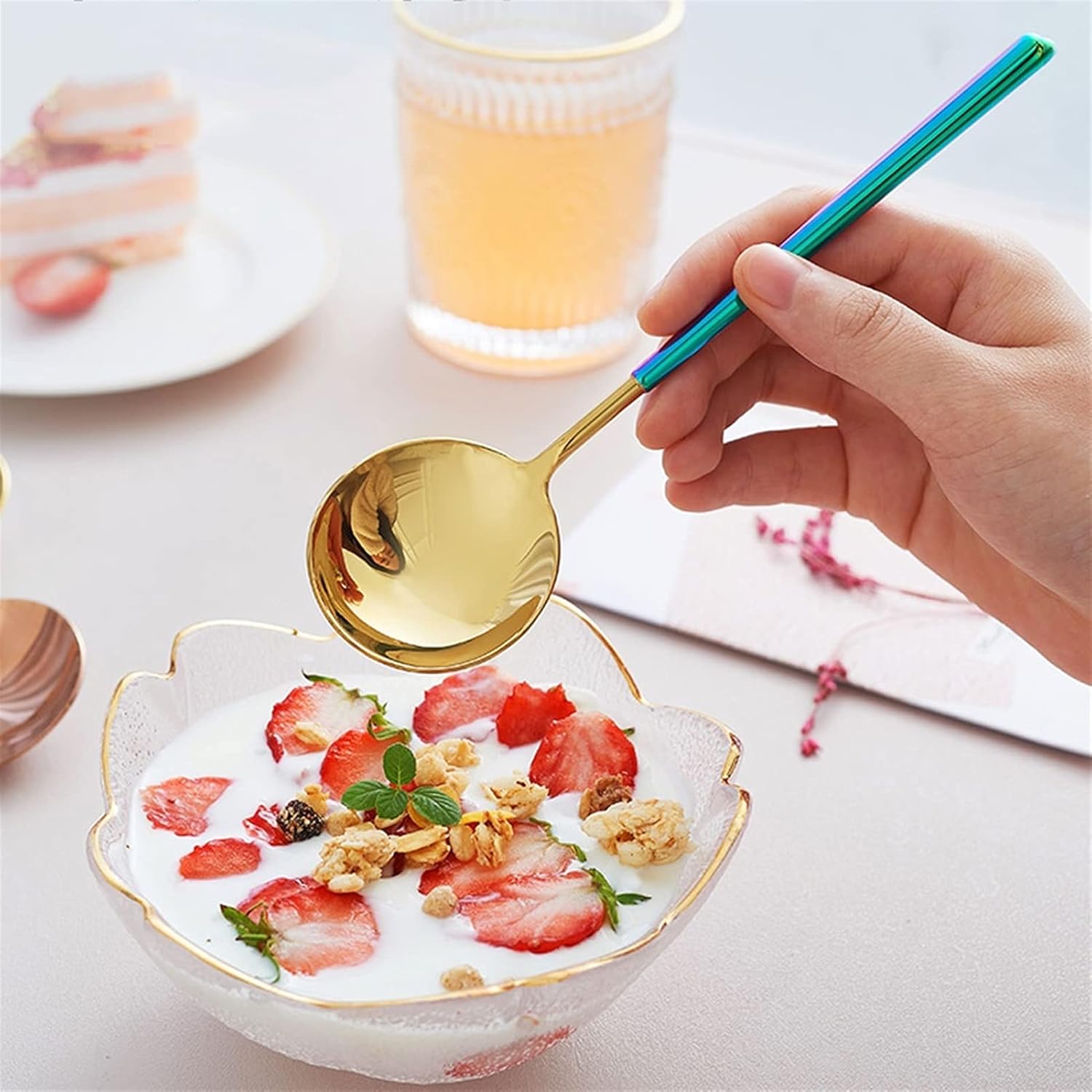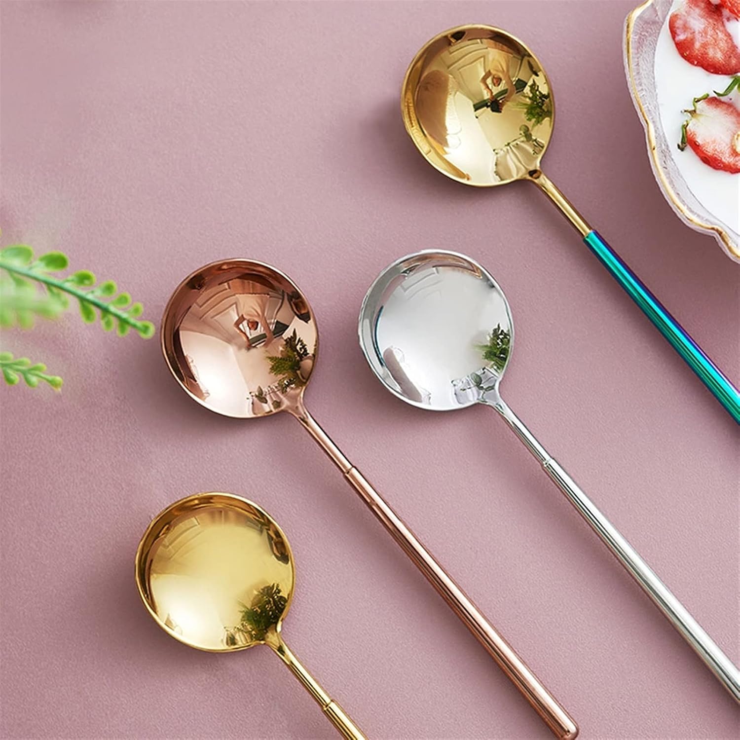 Product name: stainless steel soup spoonProduct material: stainless steelProduct color: 4 colors, please refer to the product picture to understandApplicable scenarios: family, all tables, restaurants, buffets, banquets, coffee shops, ice cream shops, cake shops, bars, etc., bars.1. Due to the different lighting and shooting angles, there may be slight chromatic aberration, please understand.2. Please confirm the color before purchasing.3. Product photos do not include products other than products.4. Manually measure the size, there may be some small errors, please refer to the actual product, thank you.5. Do not use hard cleaning tools to clean the product, so as not to scratch the surface of the product.6. Welcome to share and feedback, we can provide you with better products and services.7. If you find any problems with our products, please feel free to contact us via email, we will solve these problems as soon as possible.They allow you to replenish cutlery in time and help you complete your tableware set when you find that the set is missing a spoon.