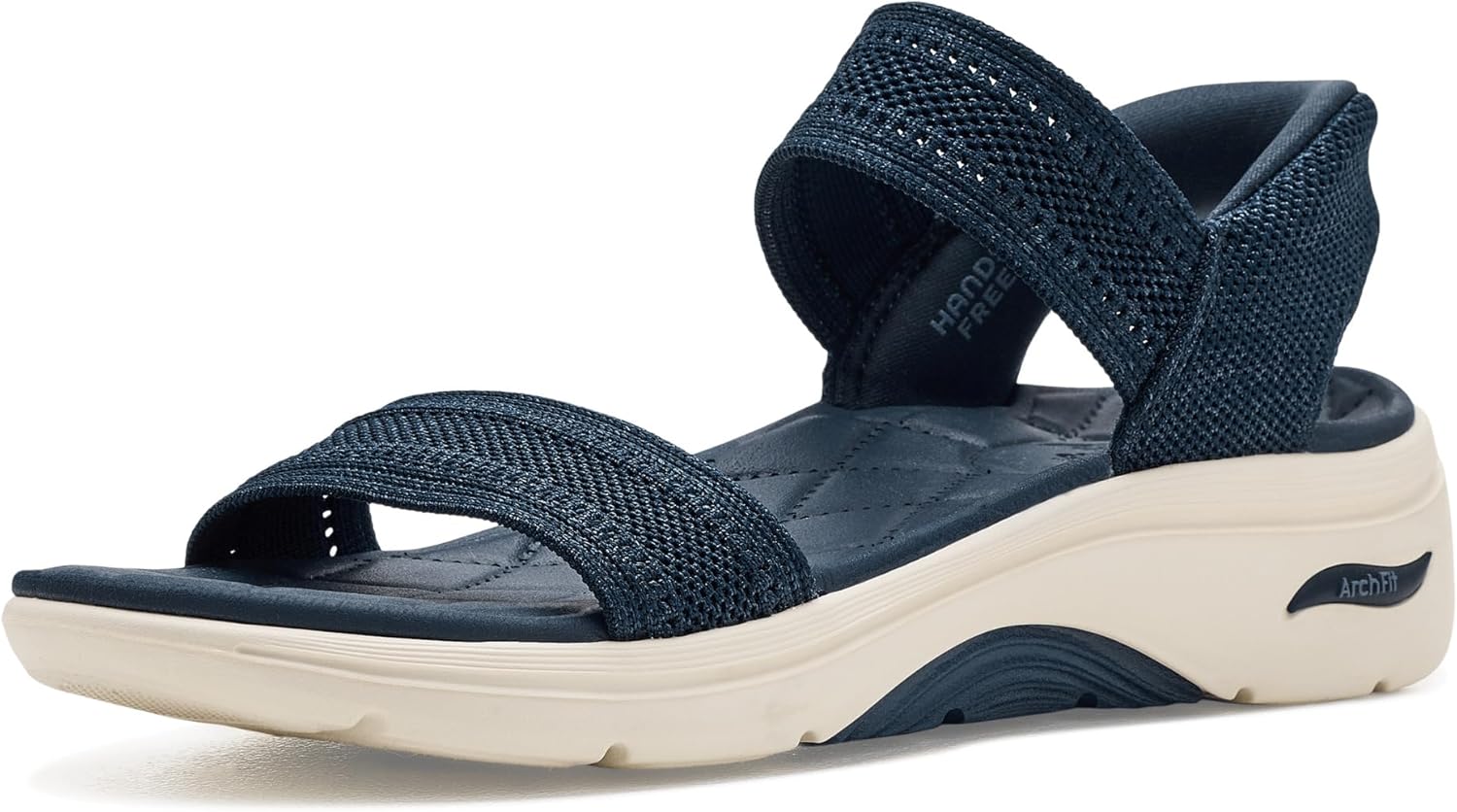 Skip the fuss and step right into the SKECHERS GO Walk Arch Fit 2.0 Sandals. Designed with a flexible spandex upper featuring subtle shiny yarn detail, this sandal delivers a modern look with a soft, stretchy feel. The easy slip-on design makes on-the-go moments seamless, while the polyester lining enhances breathability for all-day freshness. Powered by a quilted Goga Mat™ footbed and responsive ULTRA GO® cushioning, every step feels light and energized. The EVA insole and outsole work together to provide shock absorption and durability, while Comfort Pillar Technology® adds extra stability and support. The supportive wedge heel gives you a subtle lift without compromising comfort. Plus, with the APMA Seal of Acceptance and a machine-washable design, this Arch Fit® sandal blends wellness, convenience, and everyday glam perfectly.