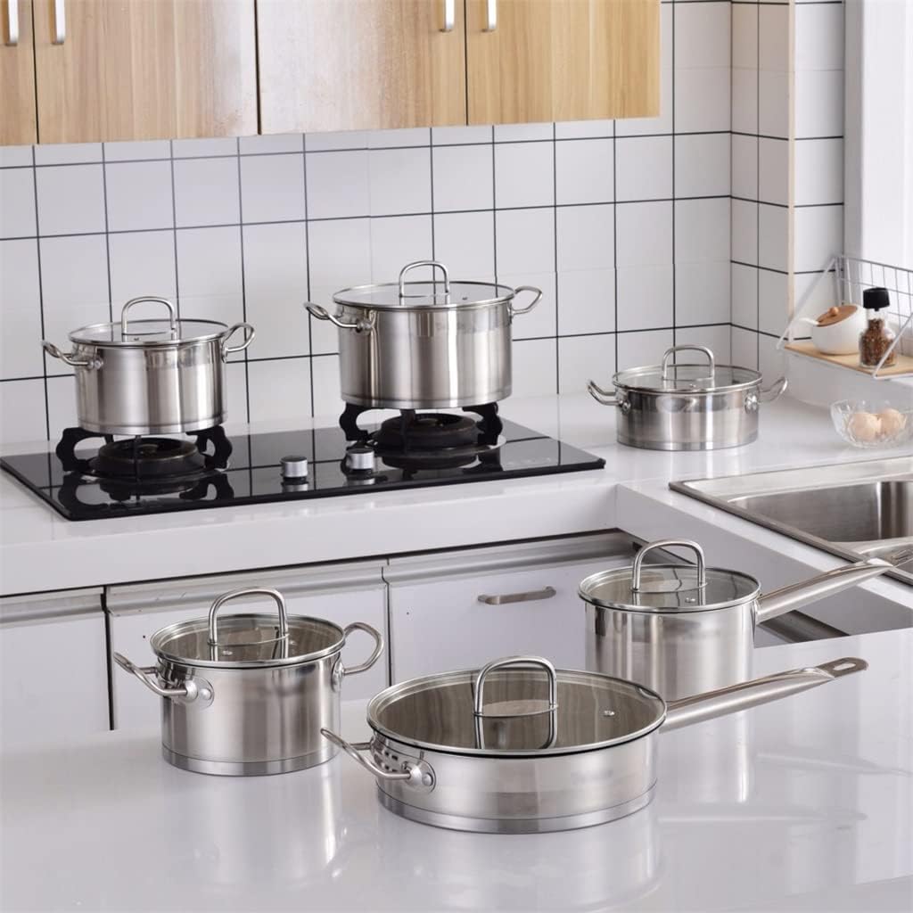 Feature:Classic Kitchen Utensils Set of 12 Pieces Made of Stainless Steel with a Polished Cooking Surface for Kitchen Countertops and Won't FadeThe glass lid allows you to clearly monitor the cooking process.Solid riveted handles provide maximum durability even when filling and heavy pans.Designed with a tight tempered glass lid with a stainless steel edge, it seals in the food's natural juices and nutrients for a healthier, tastier result.Versatile Performance - Cookware Sets for All Kitchen and Stove ConfigurationsProduct material: stainless steelColor: as picturedSize: As shownPackage includes: 1 set of pots and pans (other products not included)hint:Please allow slight deviation due to manual measurement.Due to differences between monitors, pictures may not reflect the actual colors of the item. Please refer to the actual product.Suitable for a variety of heat sources is simples and convenientMEasy to clean and not easy to stain