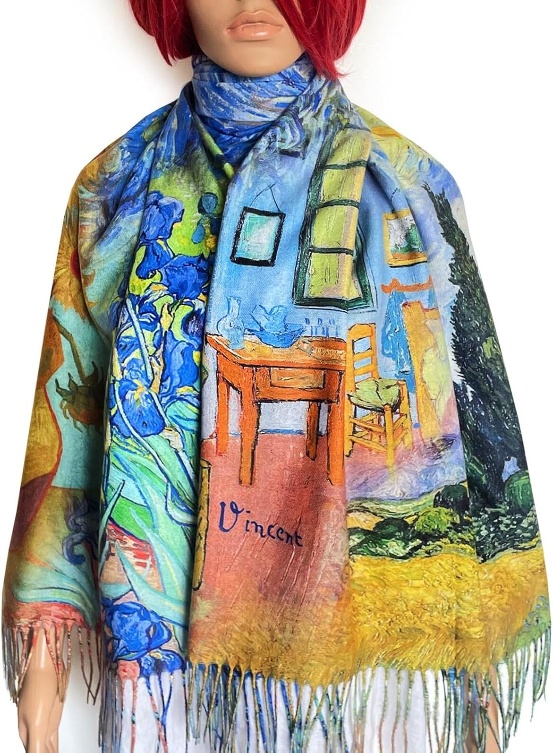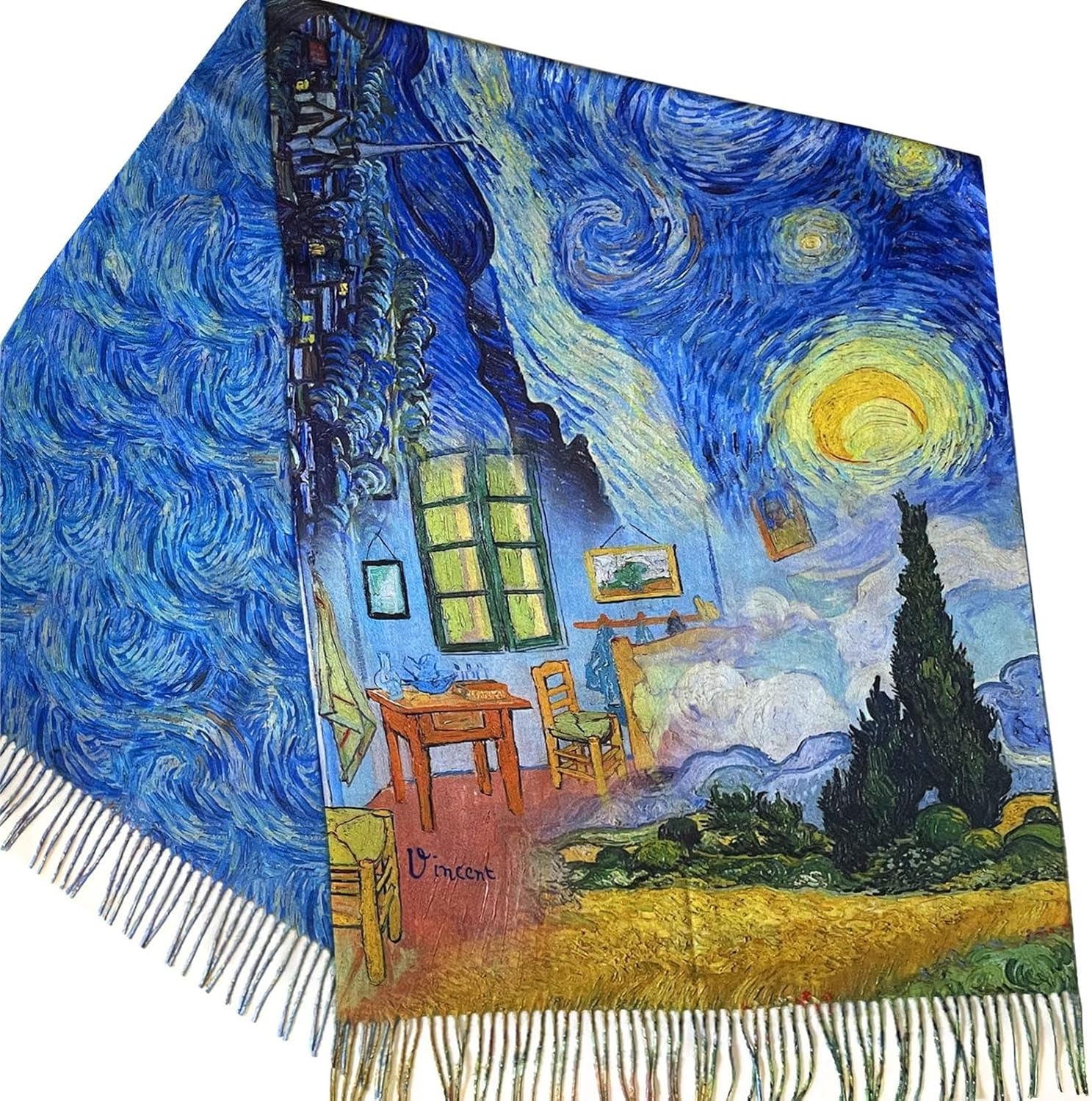 Wrap yourself in timeless art with this stunning double-sided scarf featuring Vincent van Gogh's most iconic masterpieces. The front showcases a vibrant collage of The Starry Night, Sunflowers, Irises, and The Bedroom, seamlessly blended into one wearable artwork. The back features a swirling Starry Night-inspired pattern, giving you two looks in one! Perfect for art lovers, museum enthusiasts, and anyone who admires the timeless beauty of Vincent van Gogh's masterpieces. Soft and versatile, this scarf can be worn as a scarf, shawl, or wrap to add instant elegance to any outfit. Featured Paintings: The Starry Night Sunflowers Irises The Bedroom Perfect for: Art teacher gifts Birthday or holiday gifts for art lovers Museum or gallery shop finds Statement pieces for casual or dressy looks Details: Material: Soft, medium-weight acrylic Size: Approx. 70" x 27" (with fringe) Care: Wash in warm water with mild detergent. Lay flat to dry.