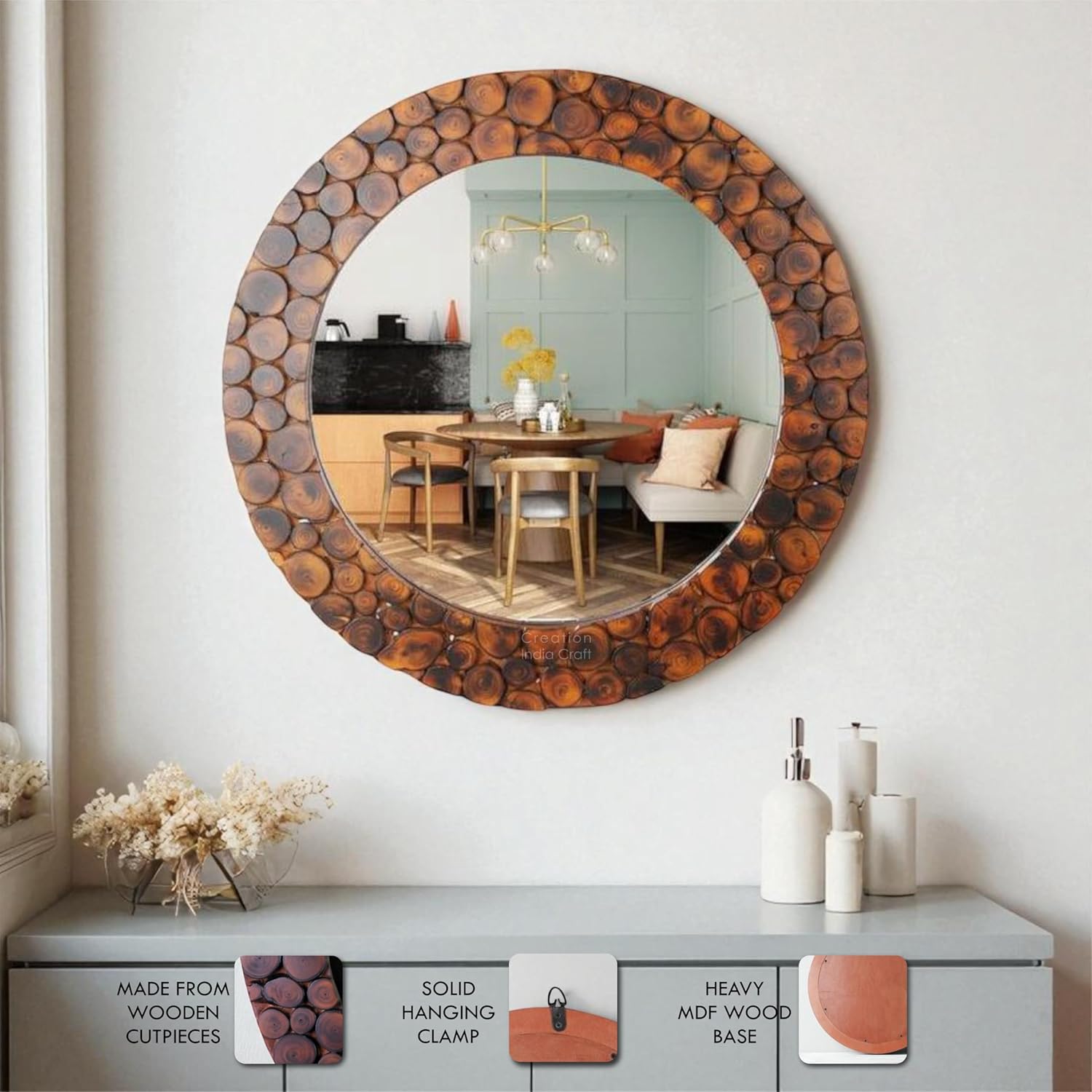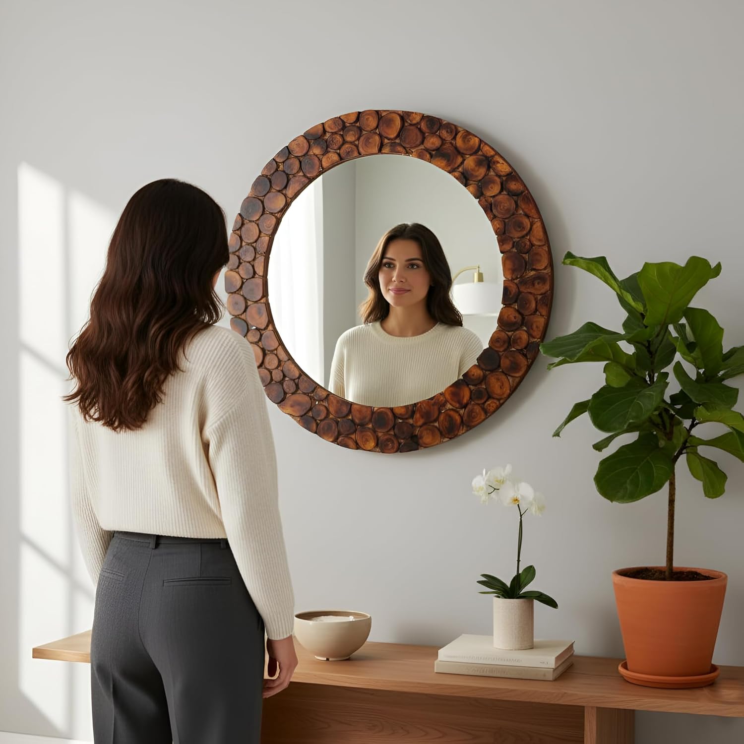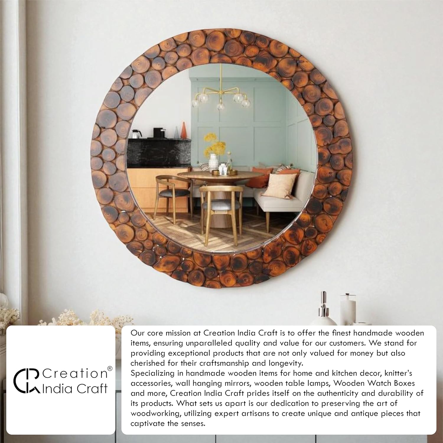 Elevate Your Space with a Touch of Rustic Charm Introducing our exquisite collection of handcrafted wooden wall hanging mirrors, designed to add a touch of natural beauty and timeless elegance to any room in your home. Each mirror is meticulously crafted from carefully selected pieces of solid wood, showcasing the unique grain patterns and natural variations that make each piece truly one-of-a-kind. The sturdy base is constructed from solid engineered wood, ensuring durability and long-lasting beauty. A Mirror for Every Style Available in a range of sizes – 13, 18, 24, 30, and 36 inches – you can find the perfect mirror to suit your space and style. These versatile mirrors seamlessly blend with various decor styles, from bohemian and rustic to modern and minimalist. Hang them above a mantelpiece, in your entryway, or even in your bathroom to create a spa-like ambiance. Experience Crystal-Clear Reflections Featuring a crystal-clear reflection, these mirrors allow you to admire your look with ease. Whether you're checking your outfit before heading out, perfecting your makeup, or simply enjoying a moment of self-reflection, these mirrors provide a clear and undistorted view. Ideal for Any Setting These handcrafted wooden mirrors are not only beautiful but also incredibly versatile. They are perfect for: Homes: Enhance your living room, bedroom, dining room, or entryway with a touch of natural elegance. Restaurants: Create a warm and inviting atmosphere for your guests. Hotels: Add a touch of sophistication and comfort to your guest rooms. Offices: Bring a touch of nature indoors and create a more relaxed and inspiring work environment.