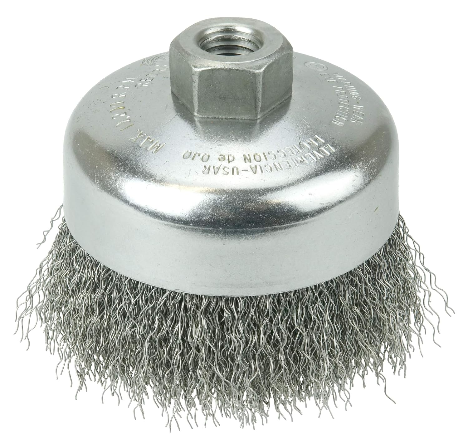 Weiler 6" Crimped Wire Cup Brush provides very flexible brushing action and the most consistent performance for demanding light to medium duty cleaning applications on relatively flat surfaces. 5/8"-11 nut for use on right angle grinders. Cup brushes are for use on portable power tools for addressing larger surface areas more efficiently than a wheel brush. Cup brushes featuring a threaded nut are designed for smooth, efficient operation on angle grinders to make quick work of large jobs. Utility cup brushes featuring a permanentlyattached 1/4" stem are more suitable for smaller jobs and are recommended for use on high-speed air tools for the most effective brushing action and longest life. Cup brushes are manufactured with individual knot hole and solid ring construction for high performance and long life. Engineered and manufactured to maximize performance and minimize operating costs in the most demanding surface conditioning applications. The use of superior construction, the highest quality materials and the most stringent manufacturing processes deliver the lowest cost-of-use and most consistent performance in heavy production environments. Made in the USA.