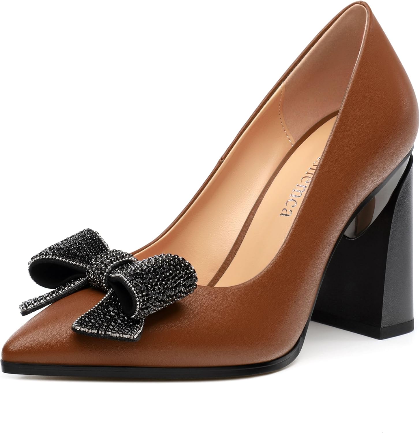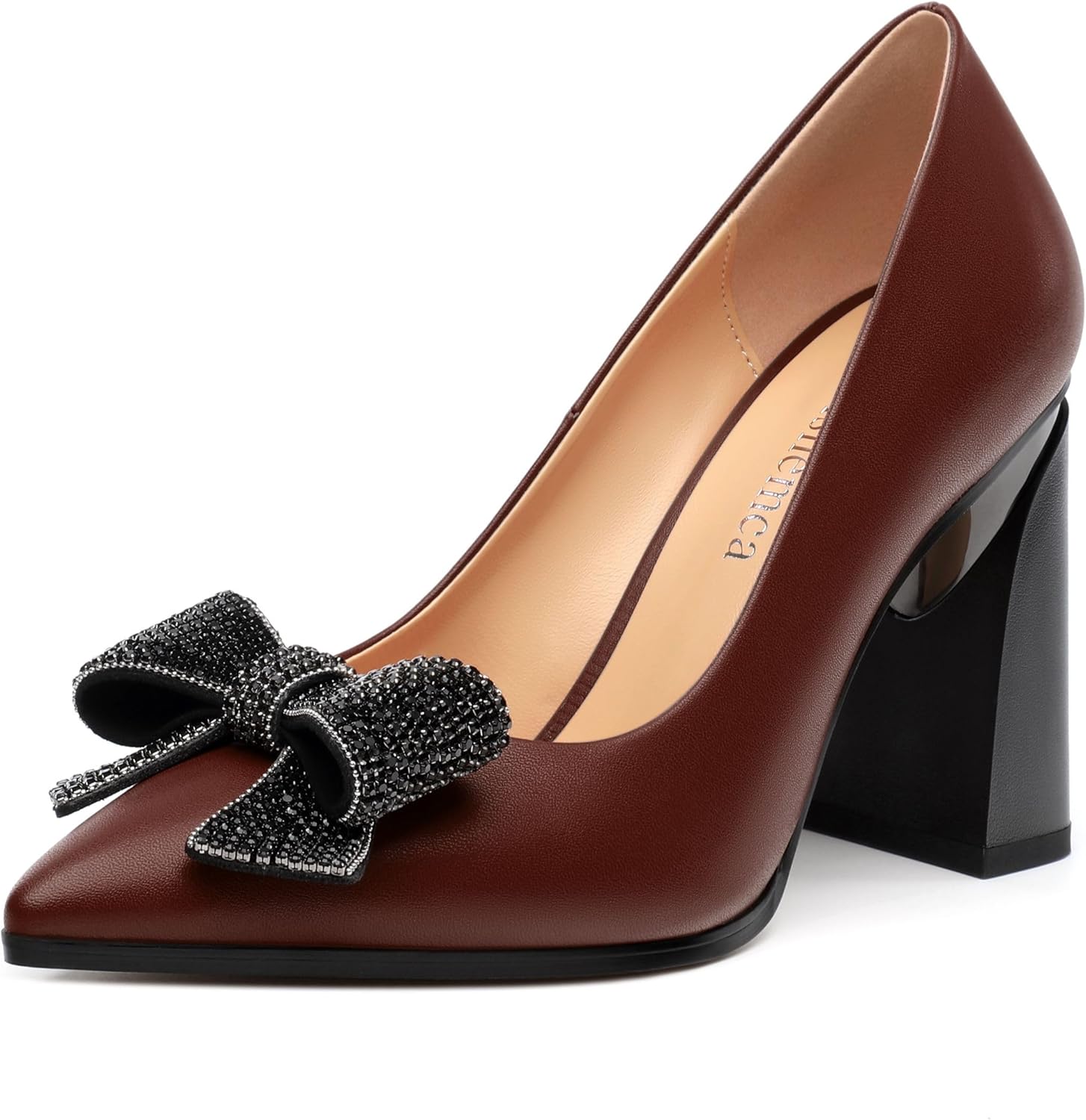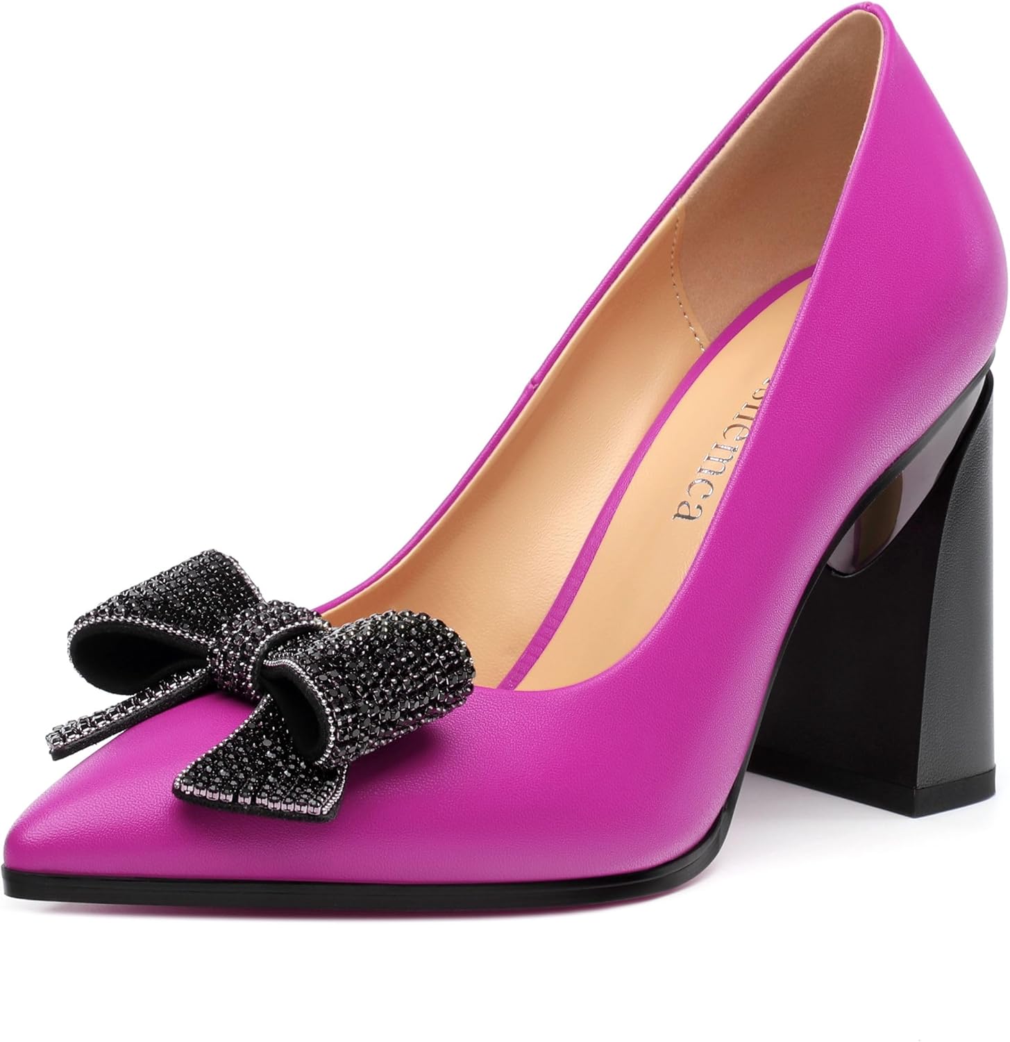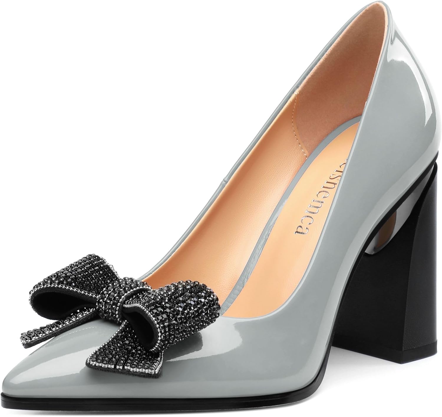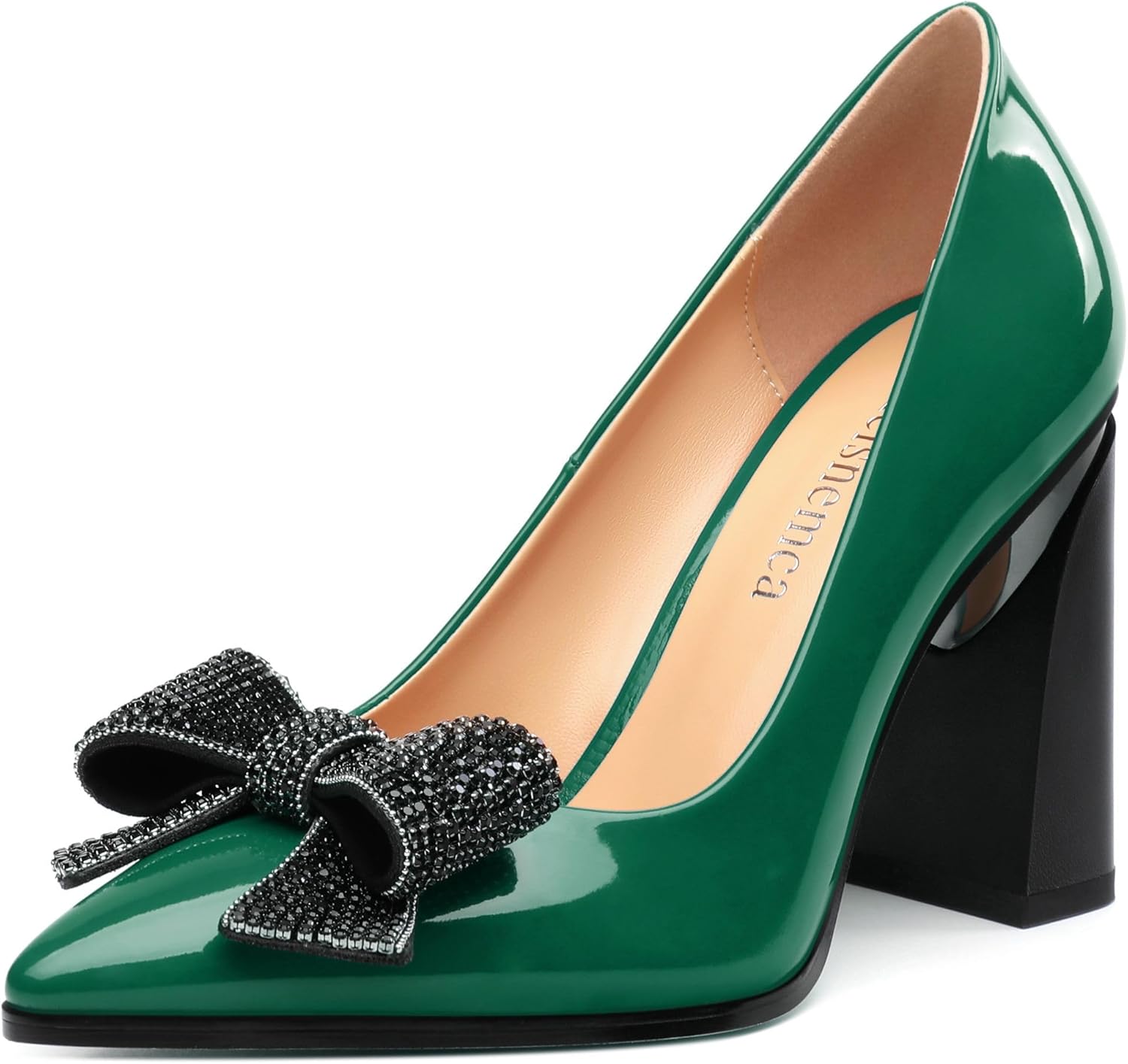 Heisnemca Womens Chunky Block High Heels Patent Closed Pointed Toe Bow Pumps Slip on Heels Wedding Party Dress Shoes 3.5IN